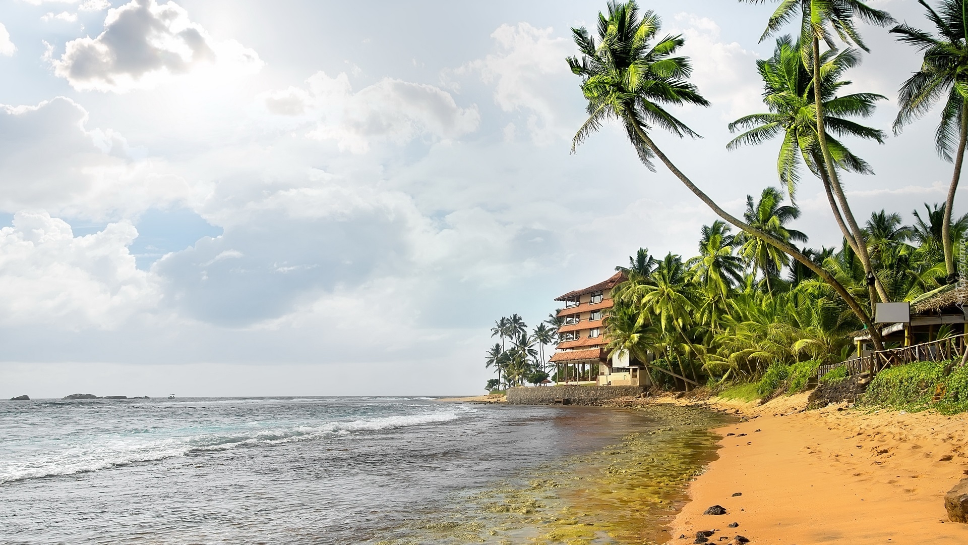 Edytor tapety: Domy pod palmami na tropikalnej plaży
