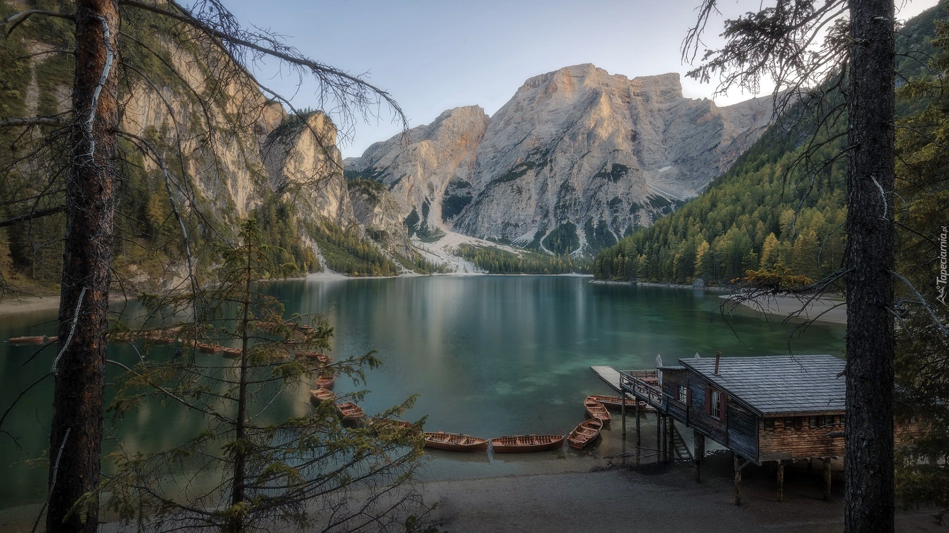 Edytor tapety: Domek drewniany i łódki nad jeziorem Pragser Wildsee