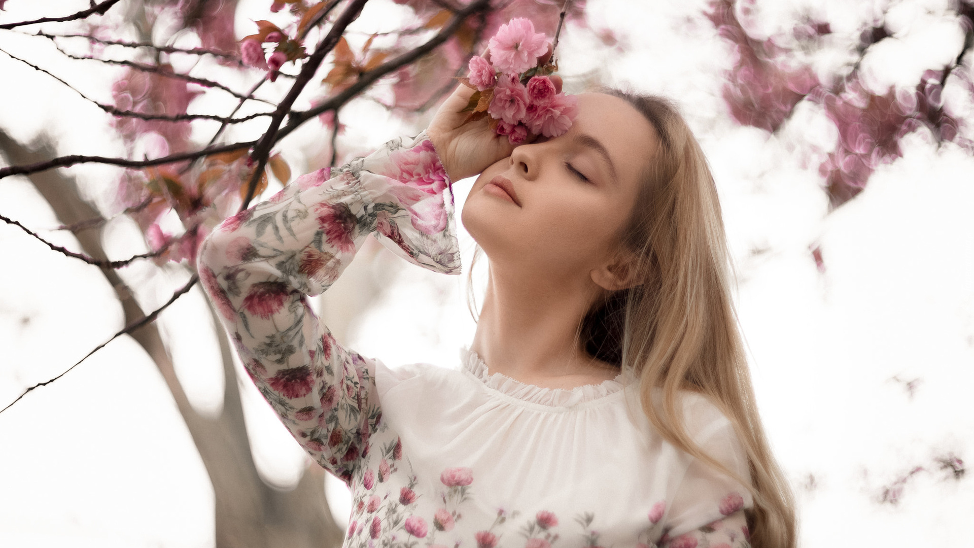 Edytor tapety: Dziewczyna pod kwitnącym drzewem owocowym