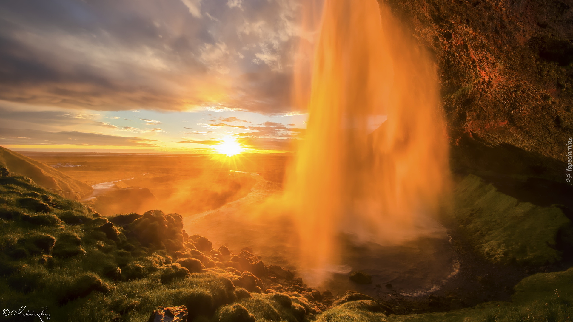 Edytor tapety: Wodospad Seljalandsfoss na tle zachodu słońca