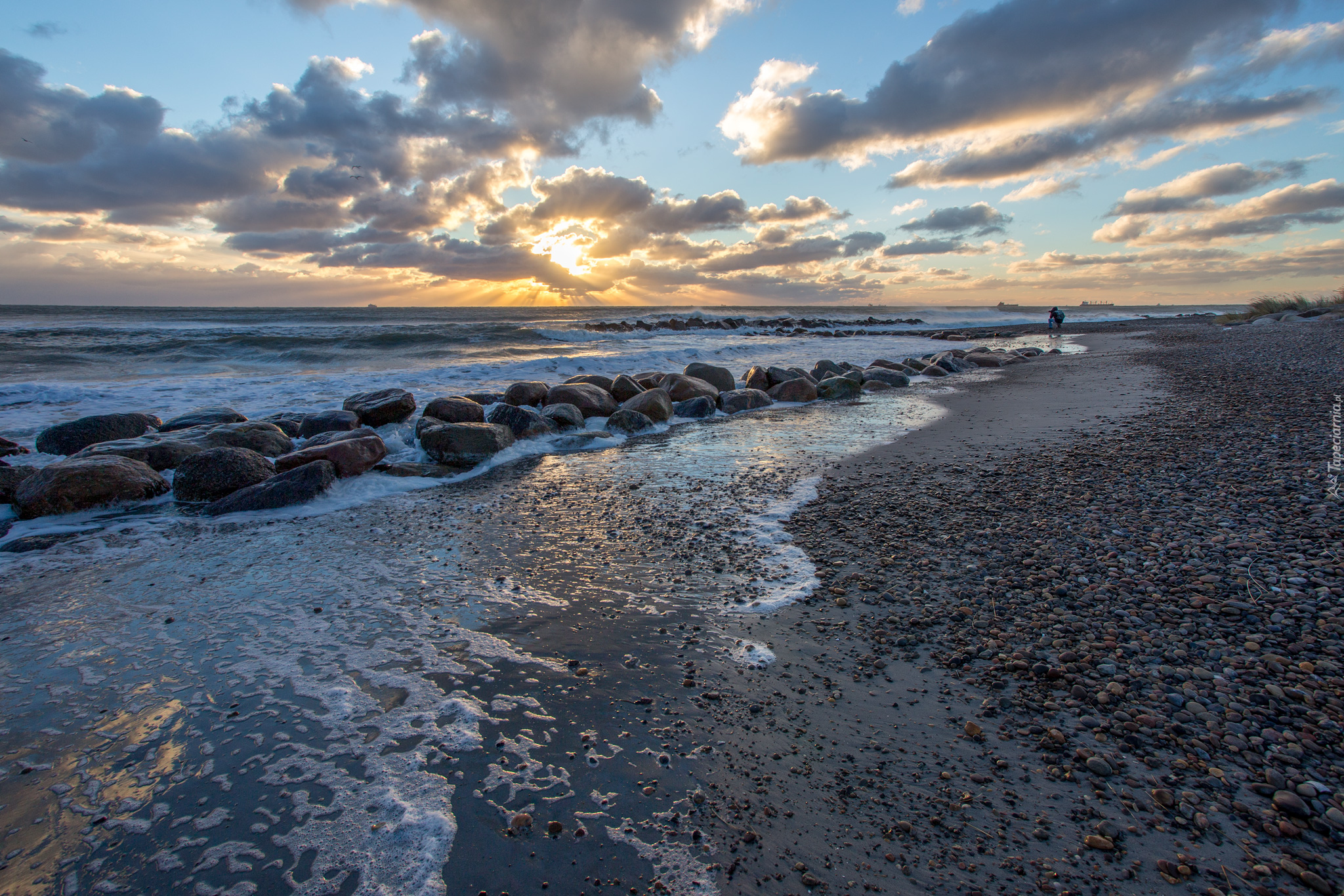 Edytor tapety: Poranek nad kamienistą morską plażą