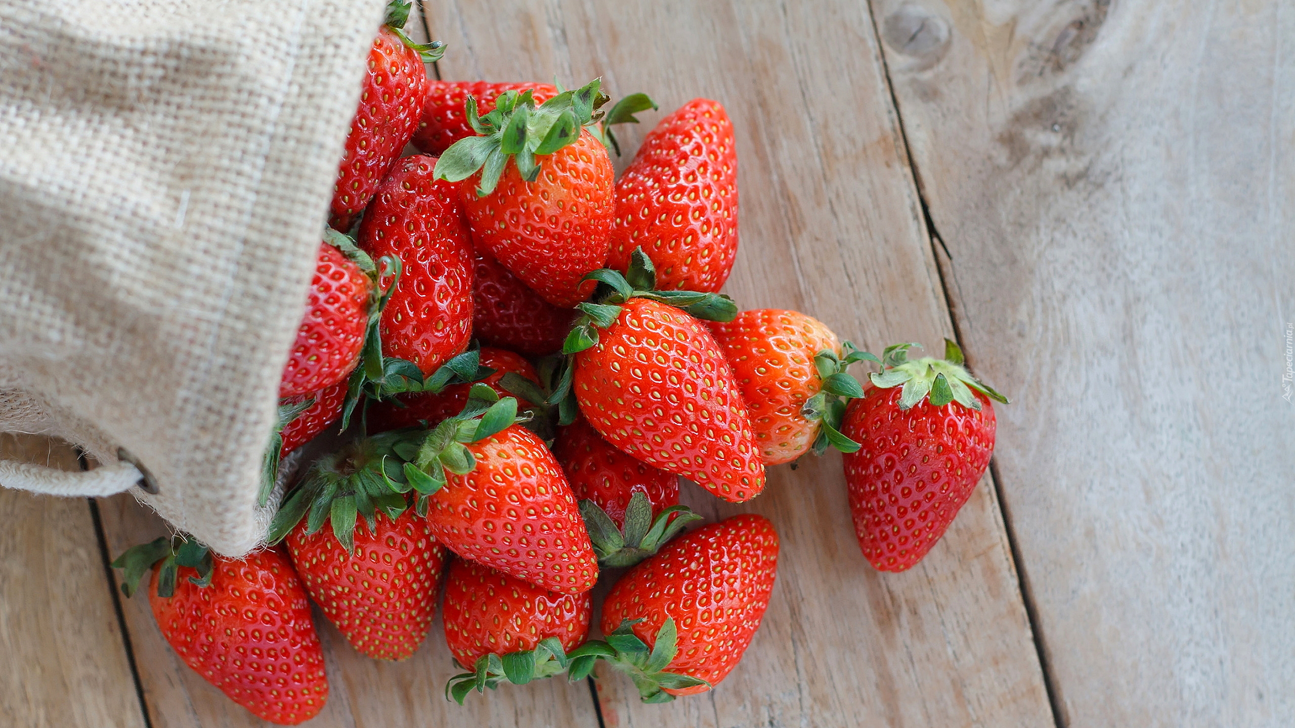 Edytor tapety: Dojrzałe czerwone truskawki wysypane z woreczka