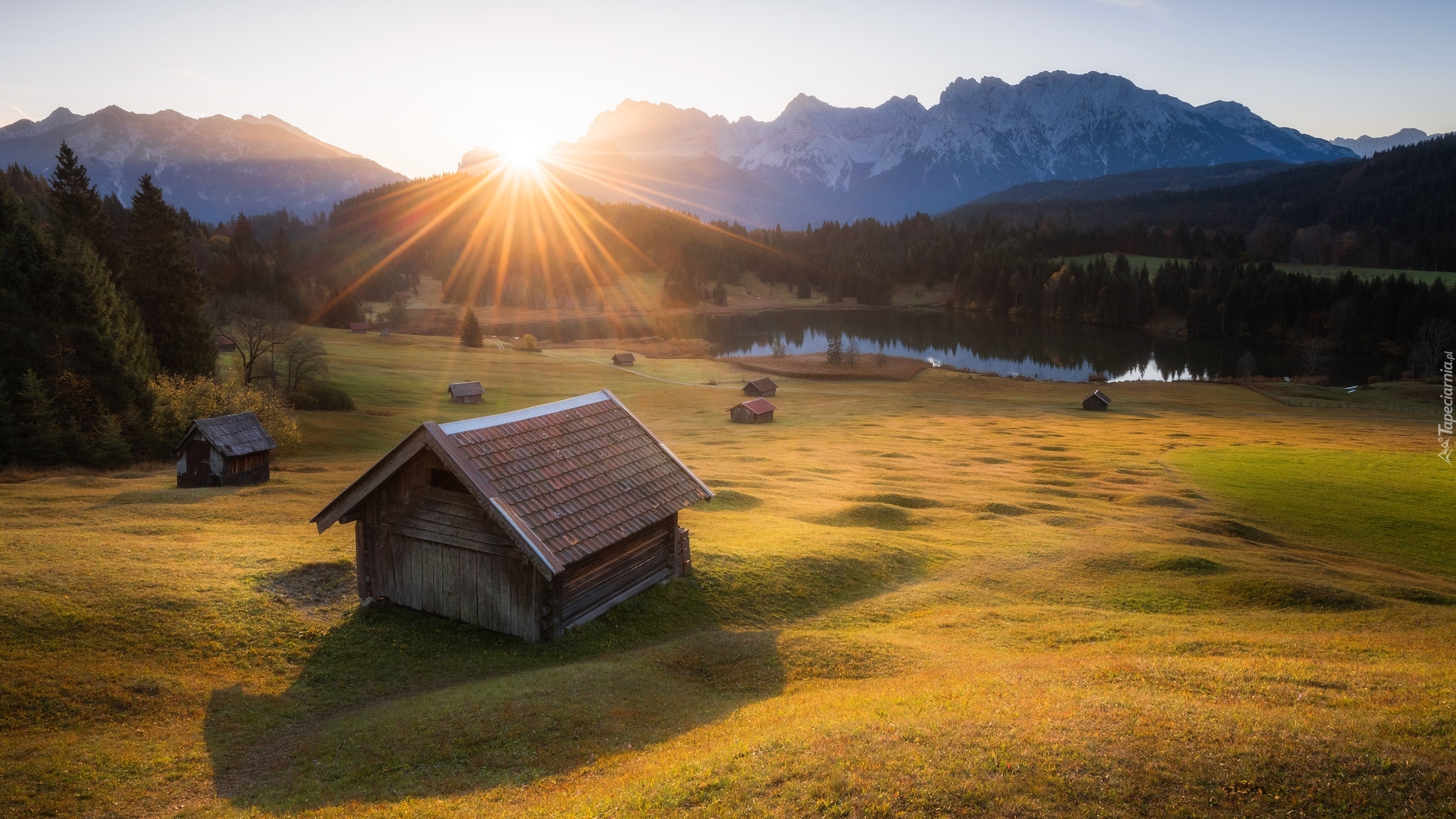 Edytor tapety: Wschód słońca nad jeziorem Geroldsee w Bawarii