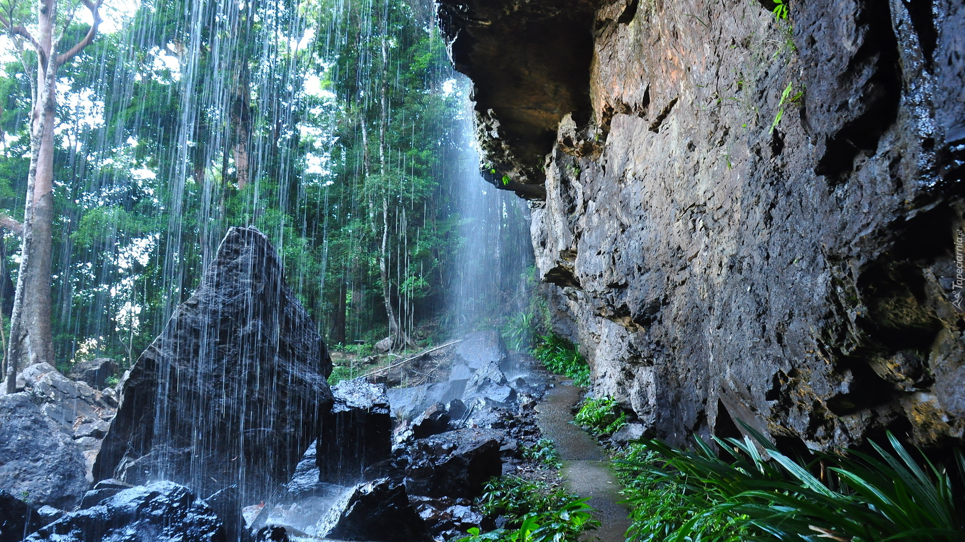 Edytor tapety: Ścieżka obok skały pod wodospadem