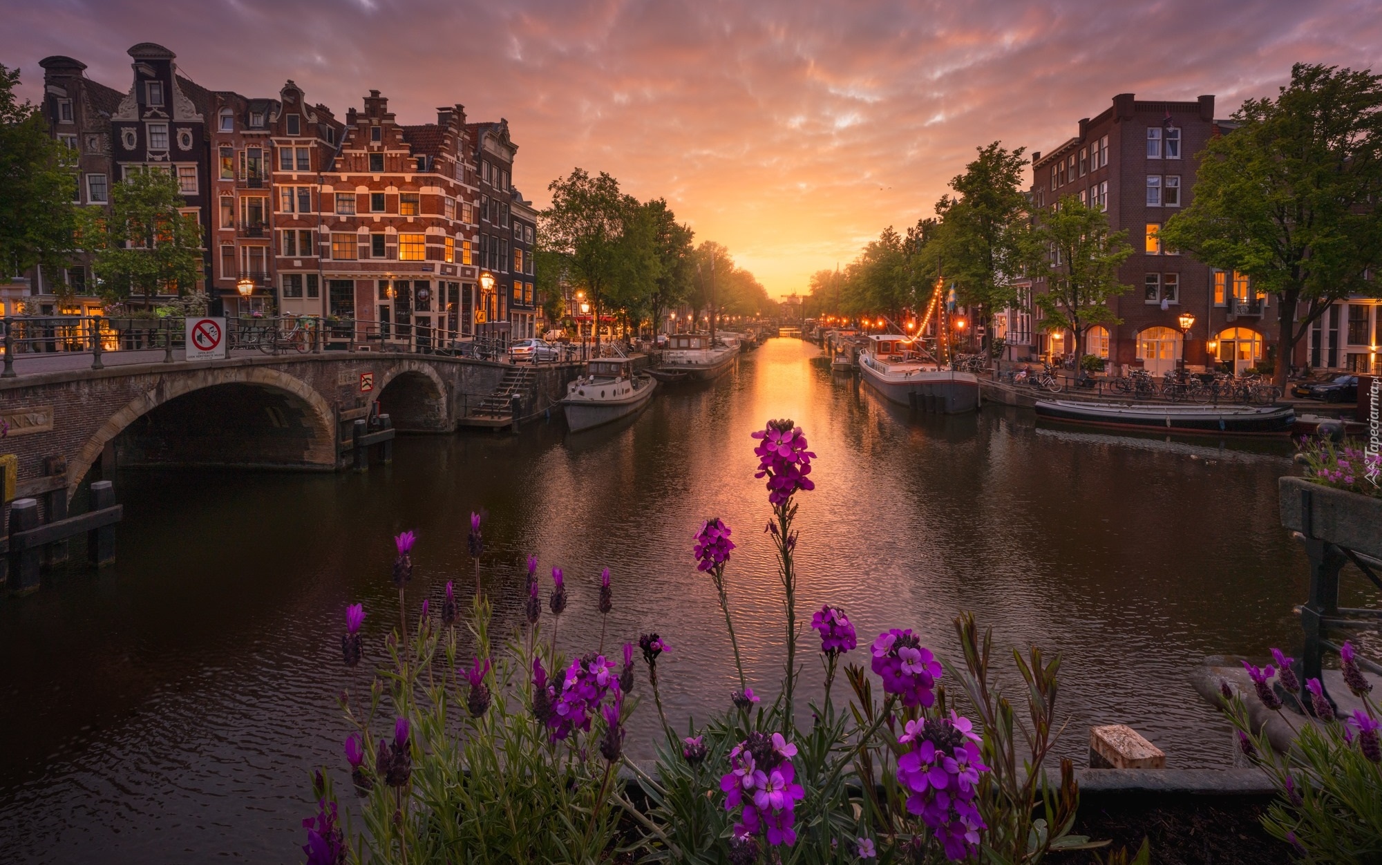 Edytor tapety: Domy nad kanałem w Amsterdamie w zachodzącym słońcu