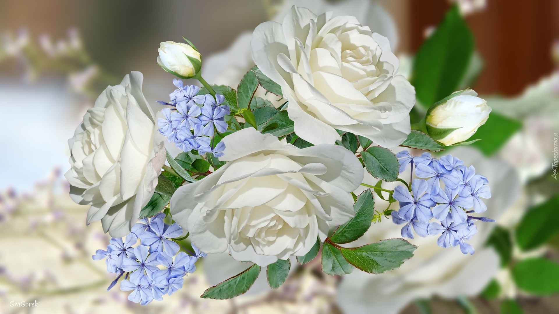 Edytor tapety: Białe róże i niebieskie kwiaty w 2D