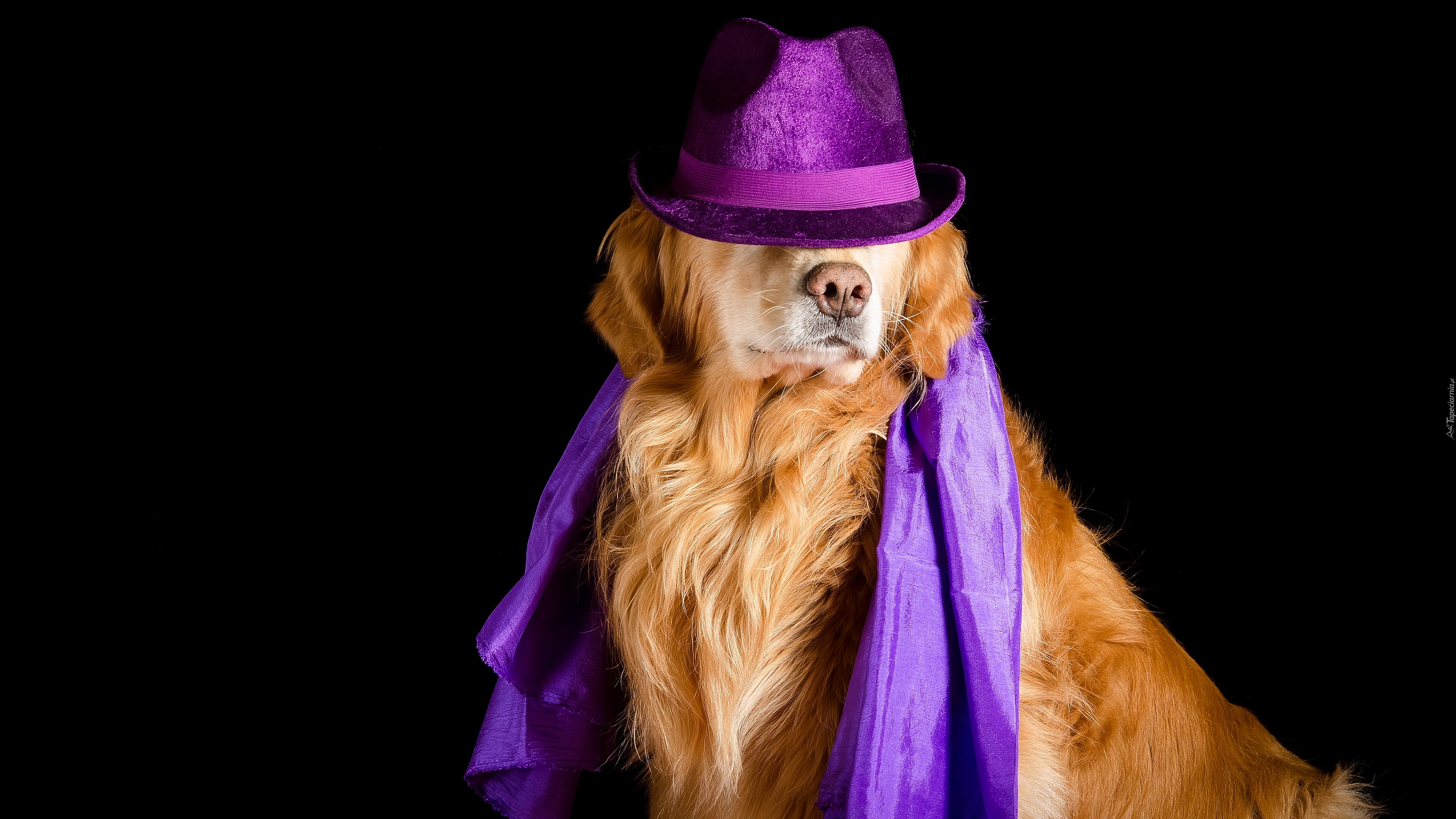 Edytor tapety: Golden retriever w fioletowym kapeluszu i apaszce