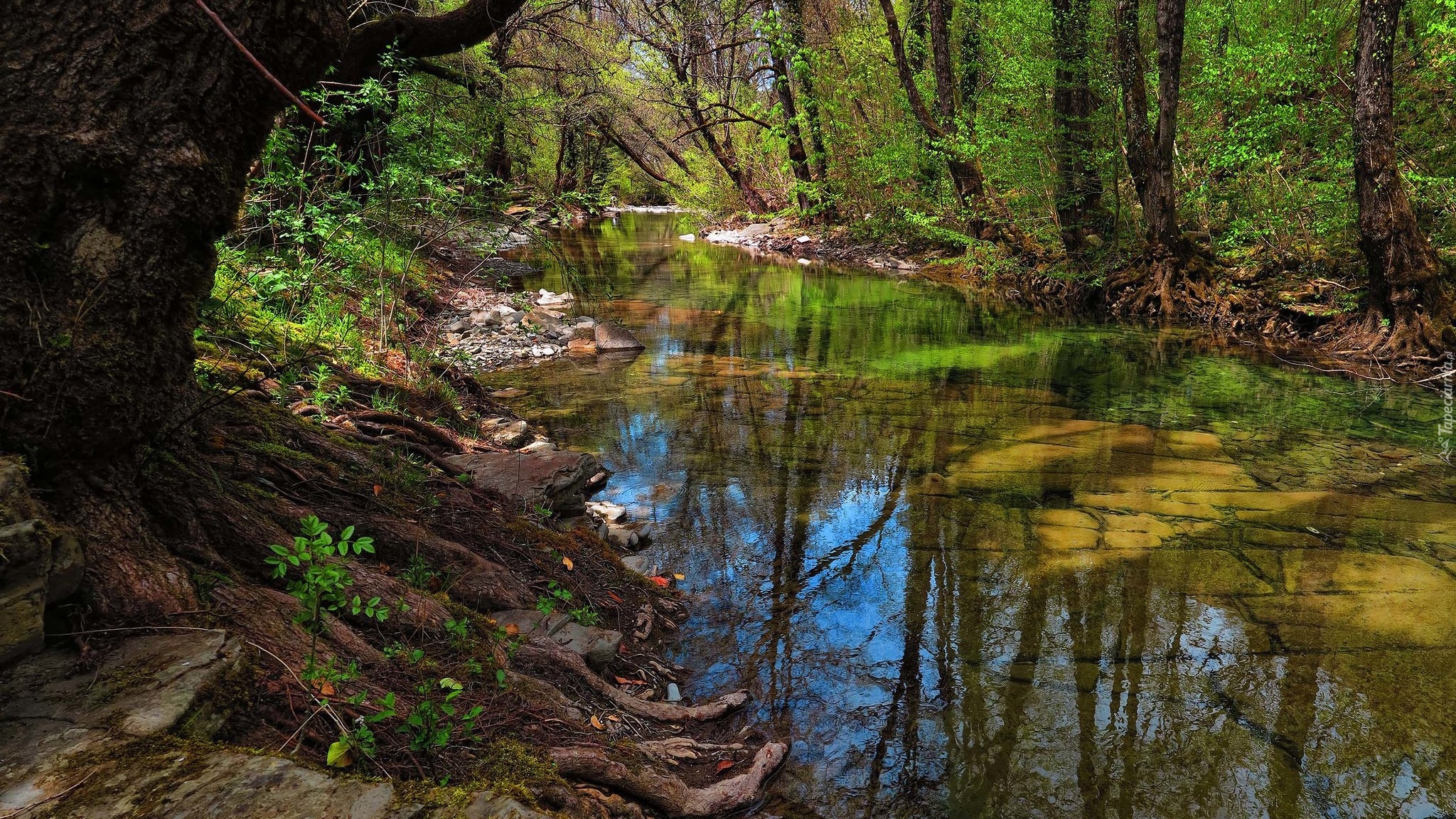 Edytor tapety: Drzewa z wystającymi korzeniami nad rzeką