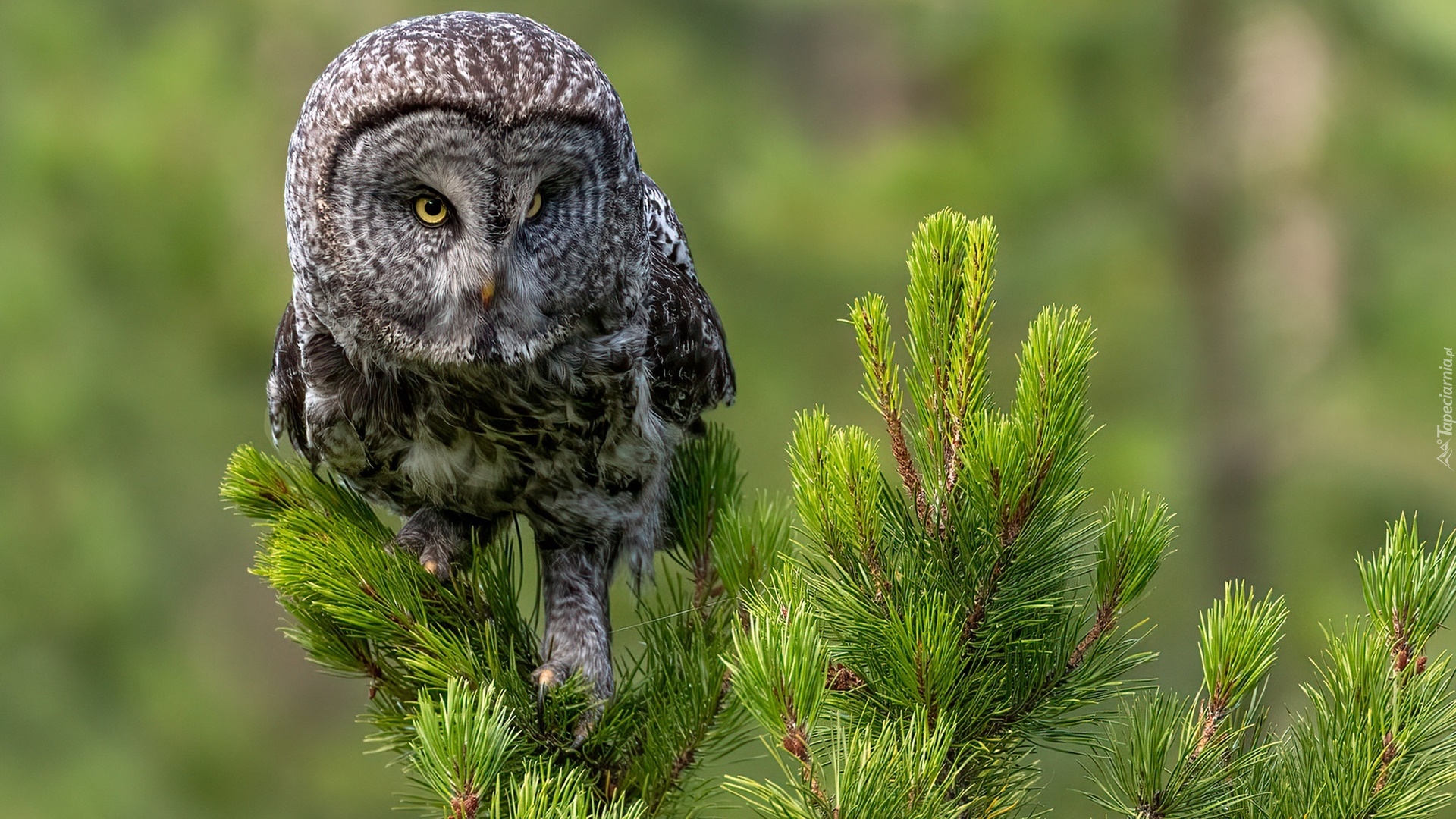 Edytor tapety: Puszczyk mszarny na świerkowej gałązce