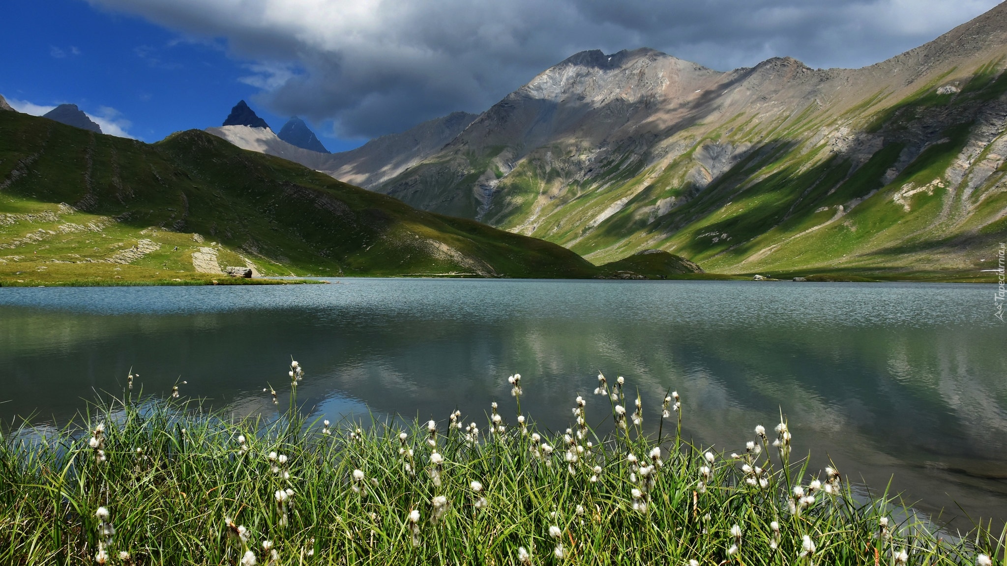 Edytor tapety: Białe kwiaty nad górskim jeziorem
