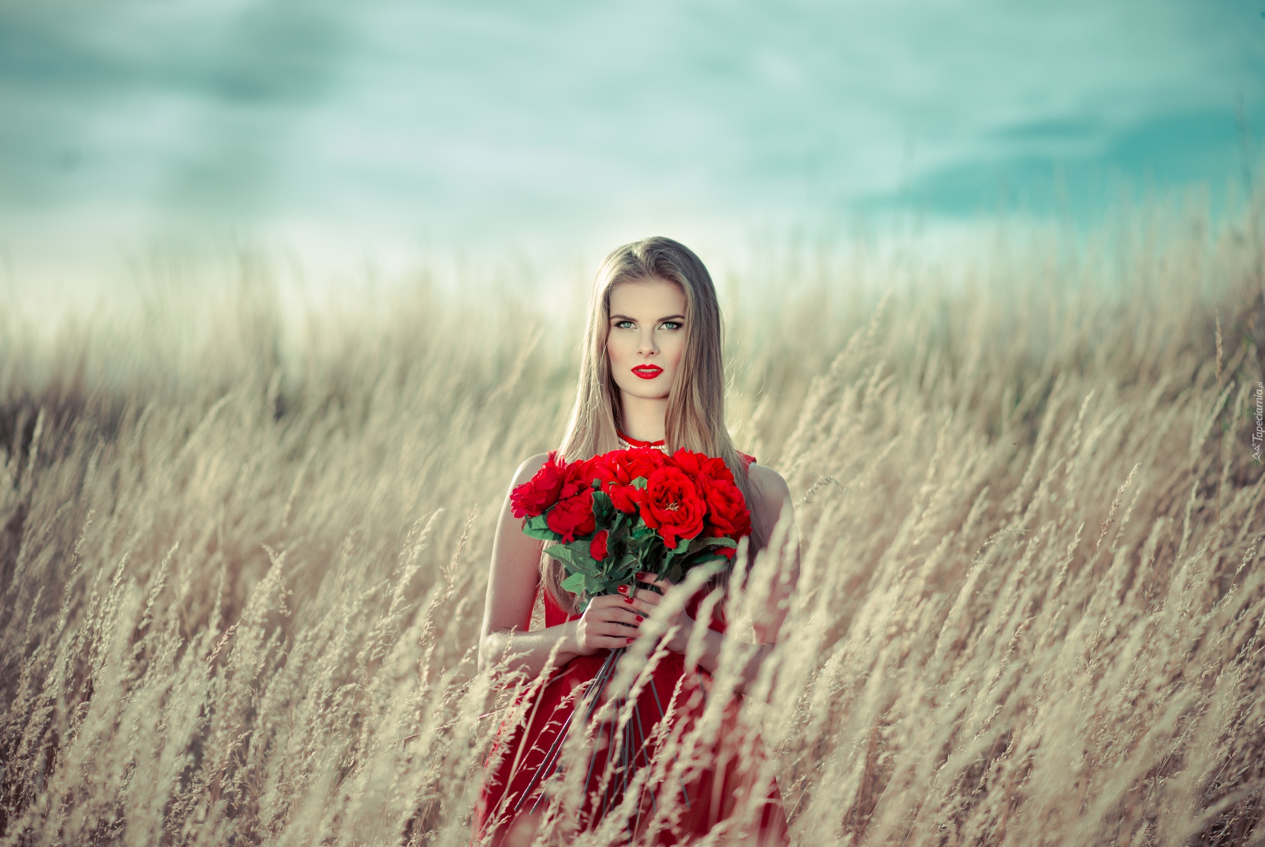 Edytor tapety: Blondynka w czerwonej sukience i bukietem róż