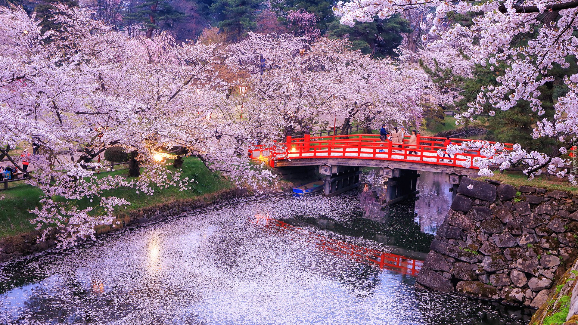 Edytor tapety: Kwitnące drzewa w parku nad rzeką