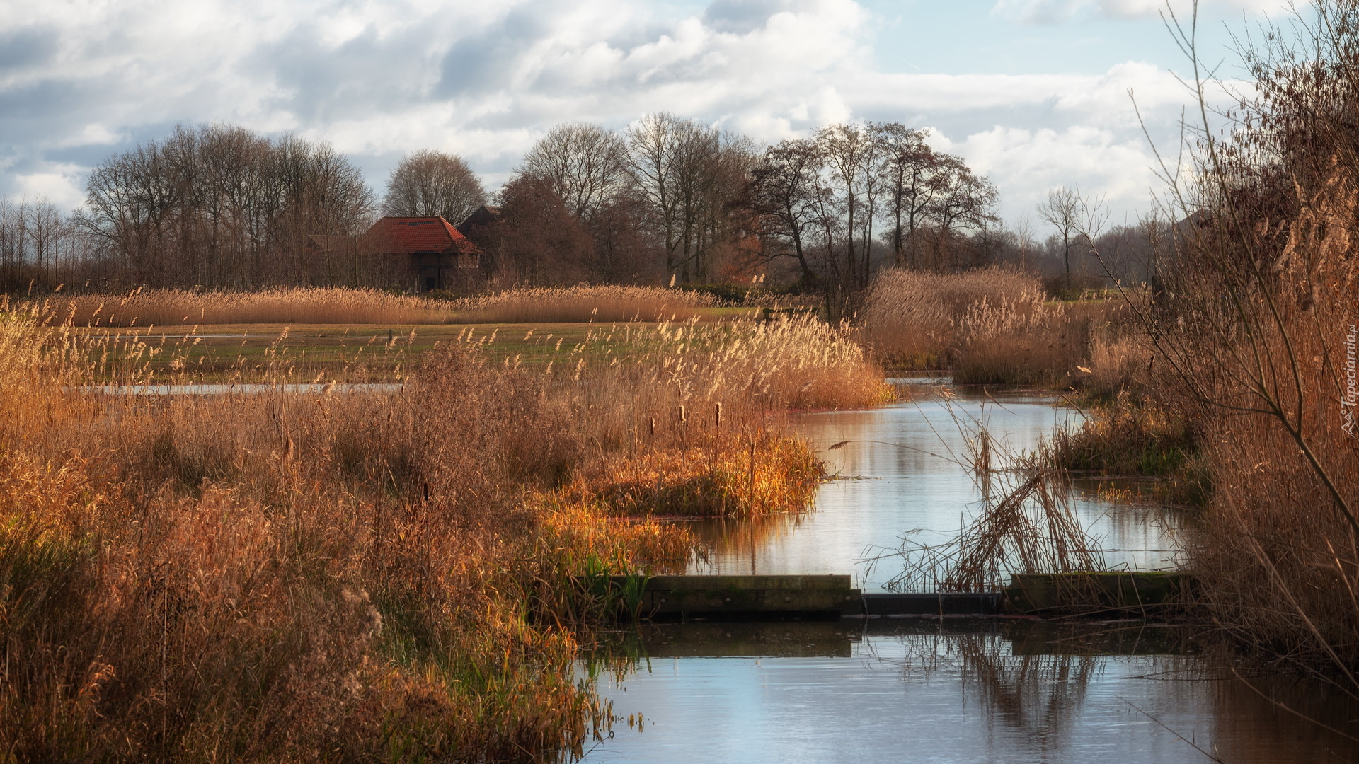 Edytor tapety: Jesienne krzewy i trawa nad brzegiem rzeki