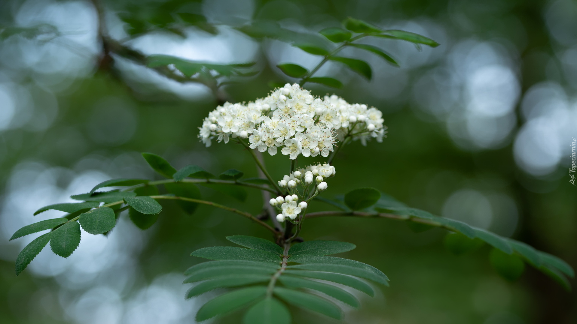 Edytor tapety: Gałązka z białymi kwiatkami i zielonymi liśćmi