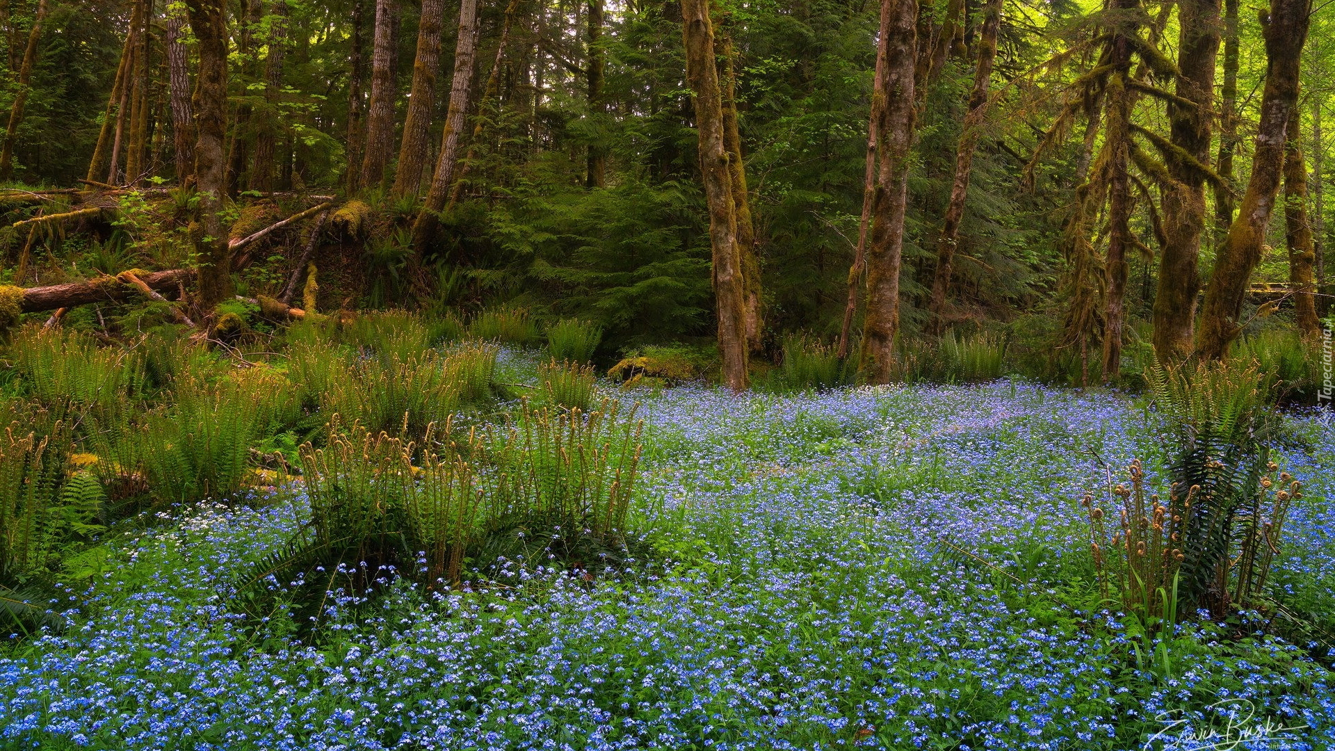 Edytor tapety: Paprocie i niezapominajki pod drzewami w lesie