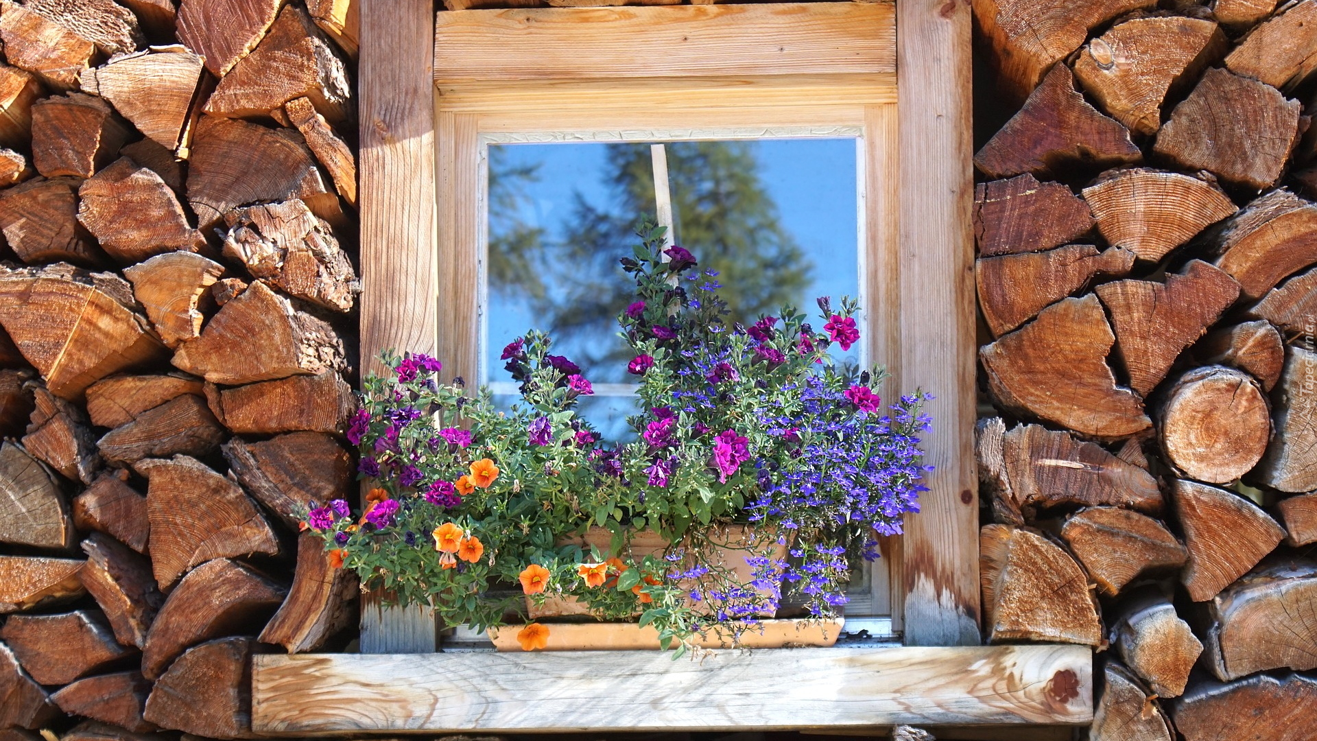 Edytor tapety: Kwiaty w doniczkach przy drewnianym oknie
