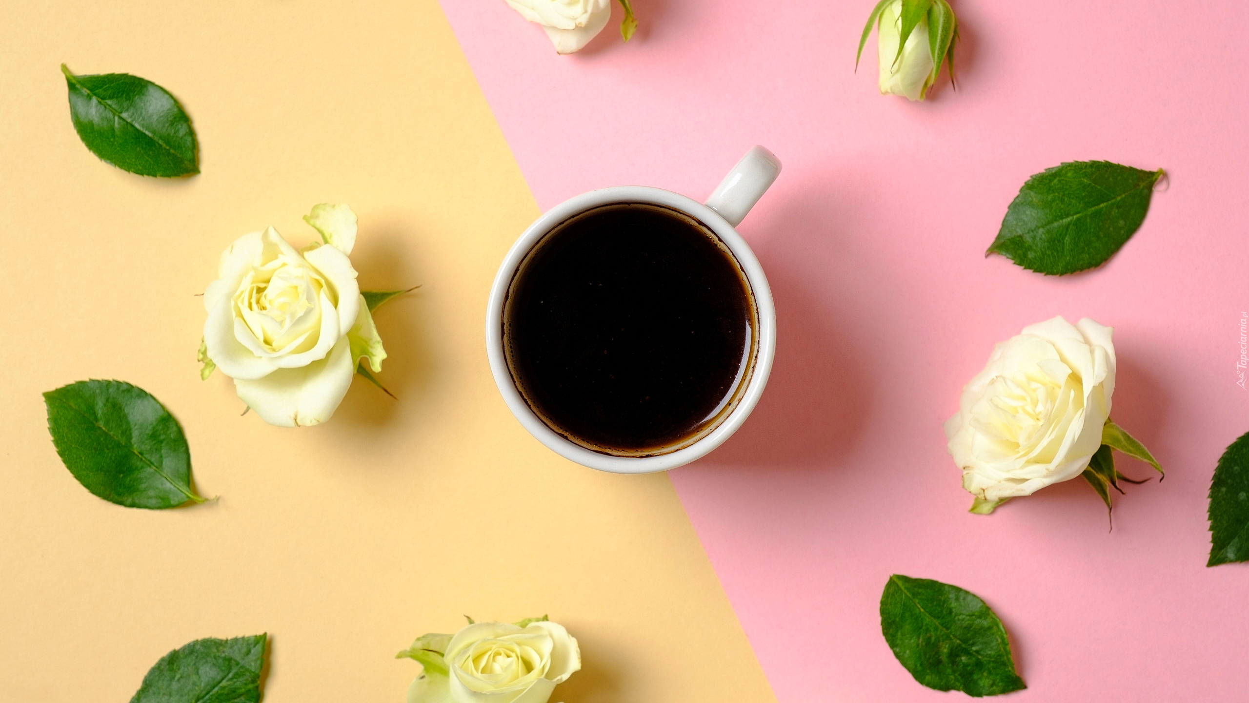 Edytor tapety: Filiżanka kawy otoczona różami i listkami