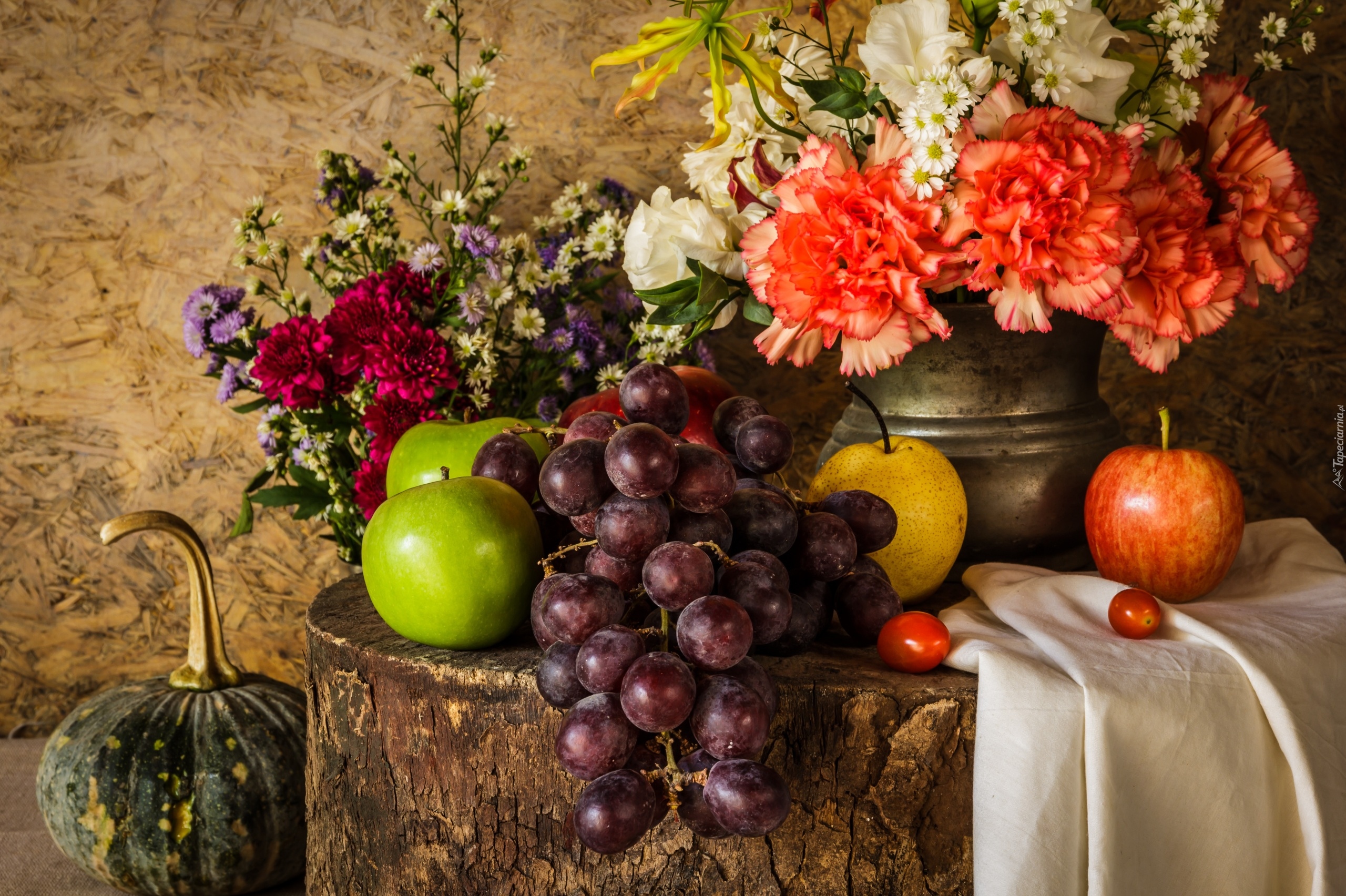 Edytor tapety: Bukiety kwiatów obok owoców na pniu