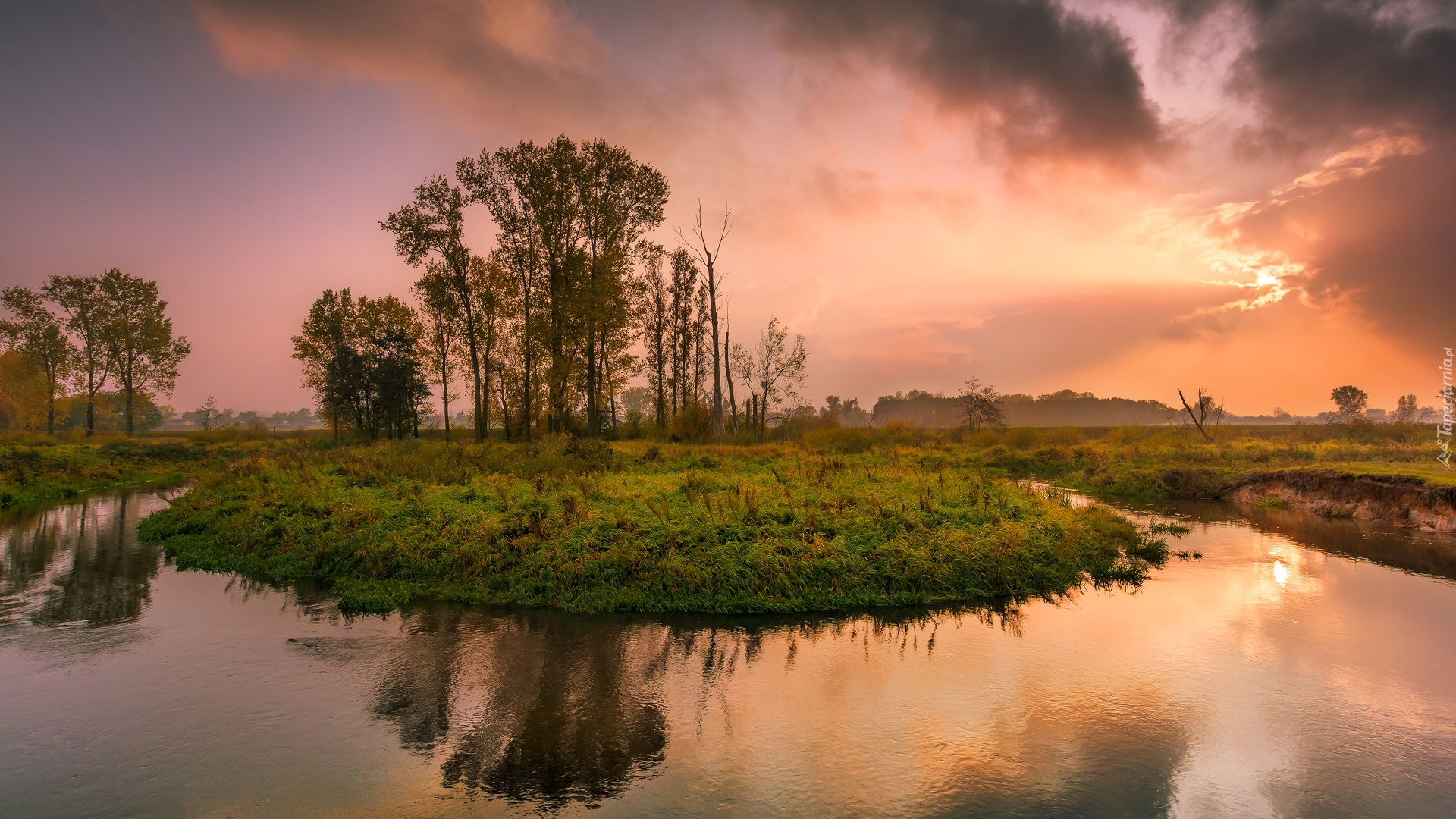 Edytor tapety: Zakole rzeki i drzewa o zachodzie słońca