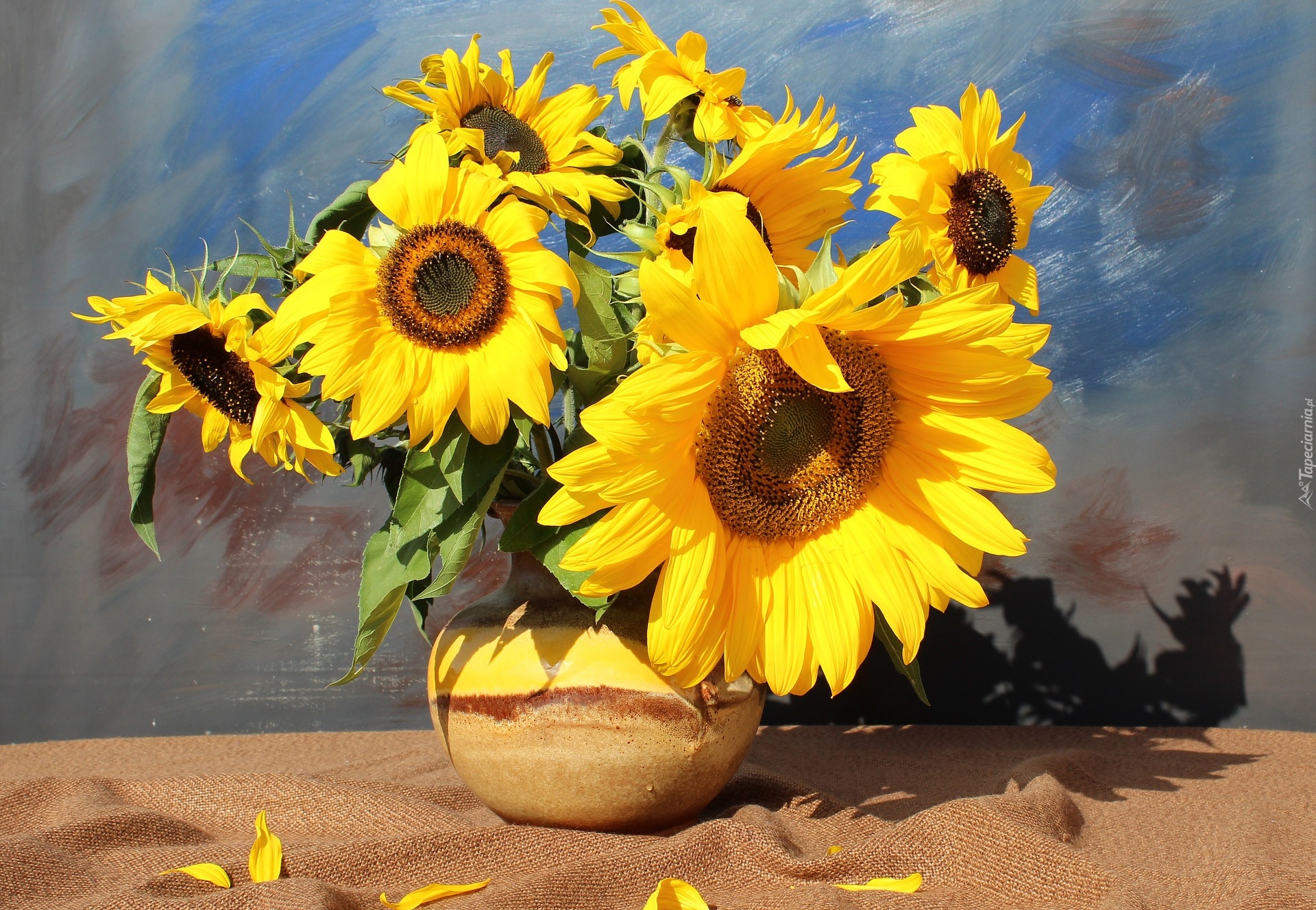 Edytor tapety: Słoneczniki w kolorowym wazoniku
