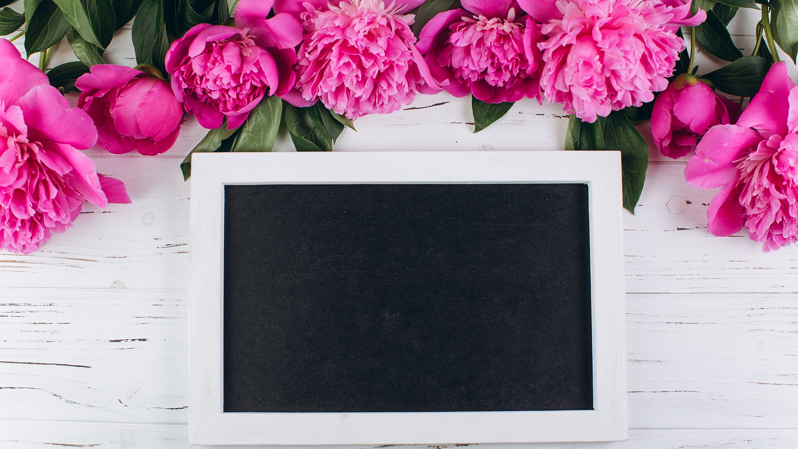 Edytor tapety: Różowe piwonie nad tabliczką