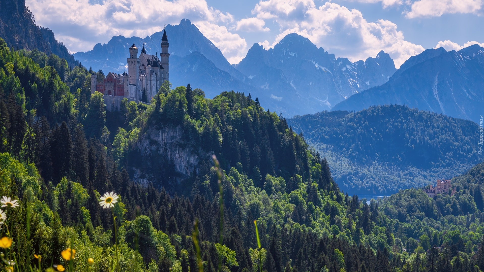 Edytor tapety: Zamek Neuschwanstein w Bawarii na tle zamglonych Alp