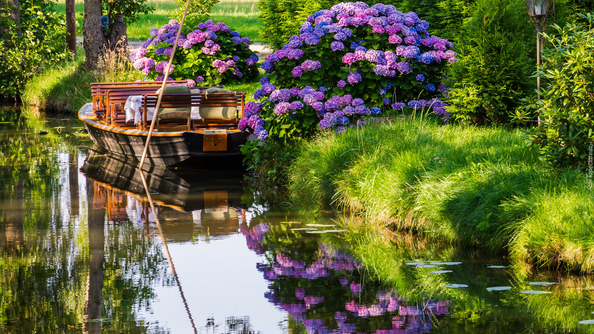 Edytor tapety: Hortensje obok łódki na rzece w parku