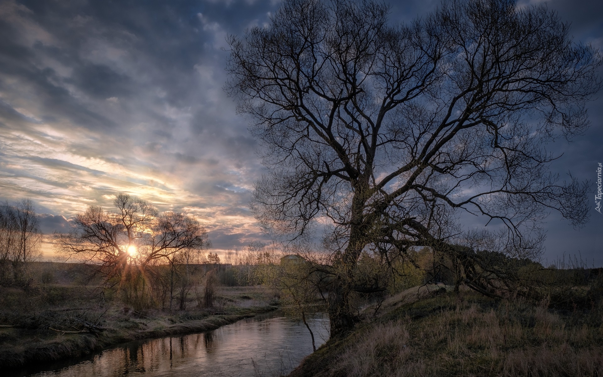 Edytor tapety: Promienie wschodzącego słońca nad rzeką Istrą