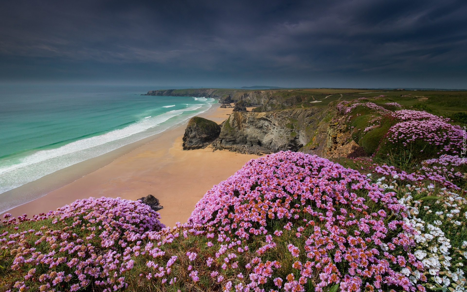 Edytor tapety: Kwiaty zawciągu nadmorskiego na tle wybrzeża w Kornwalii