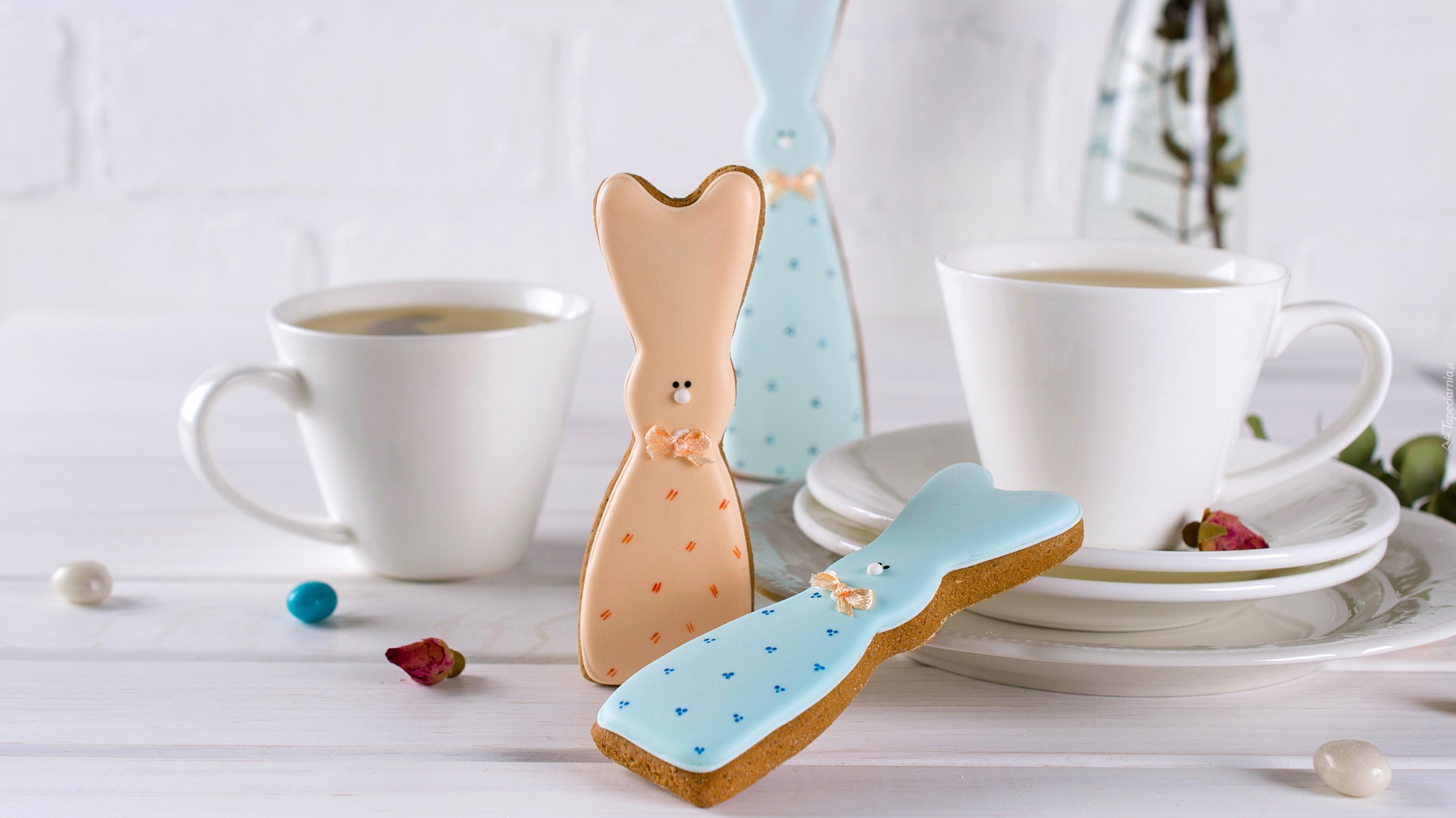 Edytor tapety: Lukrowane zajączki przy filiżance herbaty