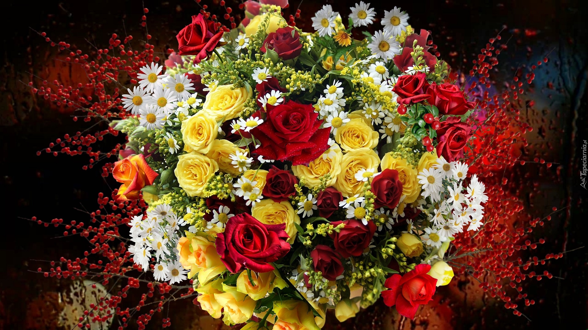Edytor tapety: Bukiet róż i złocieni z przybraniem
