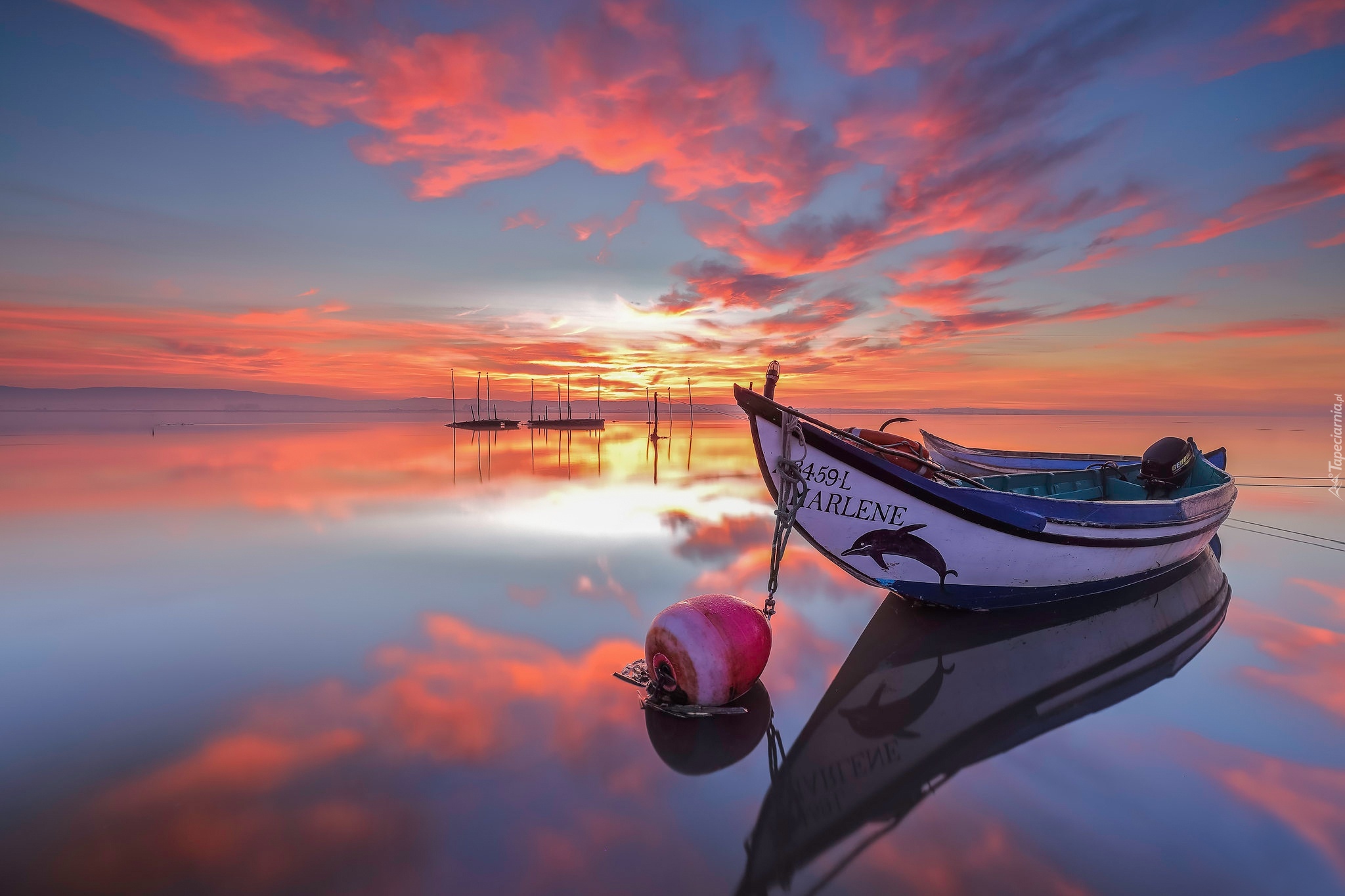 Edytor tapety: Łódka zacumowana na jeziorze pod kolorowym niebem