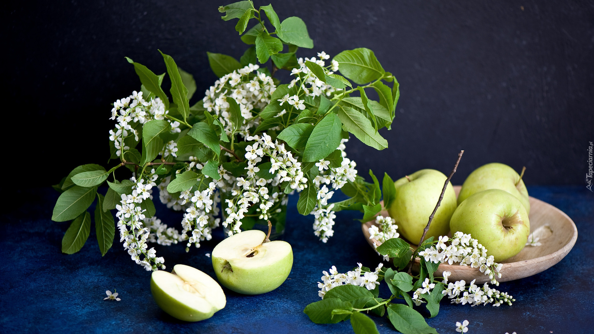 Edytor tapety: Jabłka obok kwitnących gałązek