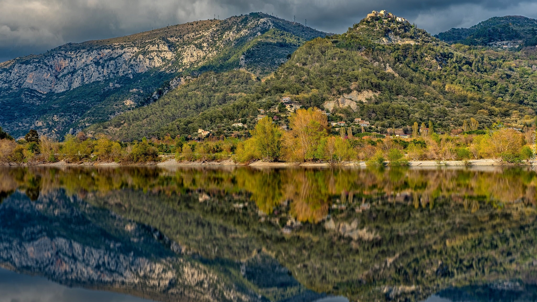 Edytor tapety: Odbicie zalesionych i gór i drzew w jeziorze