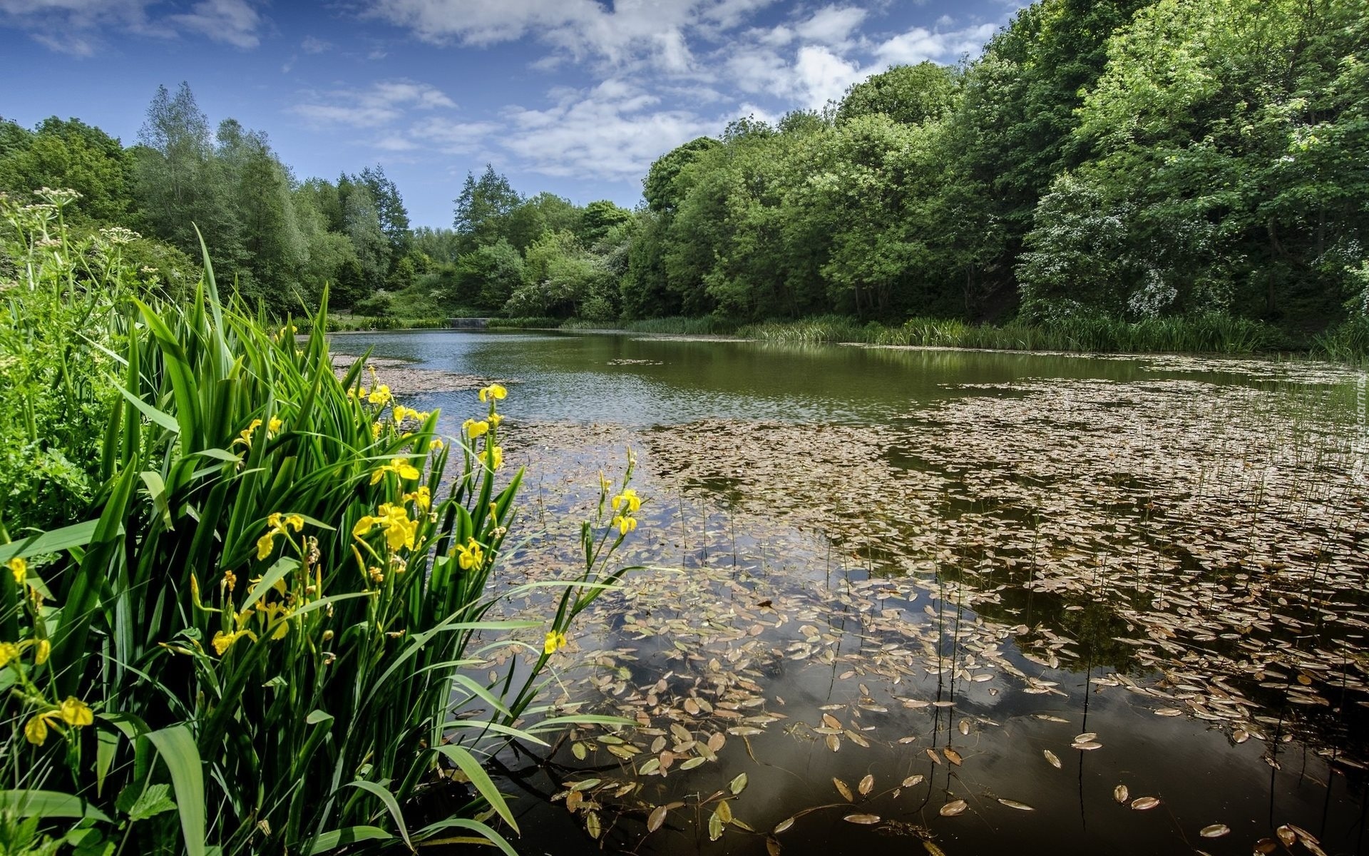 Edytor tapety: Irysy wodne i drzewa przy jeziorze