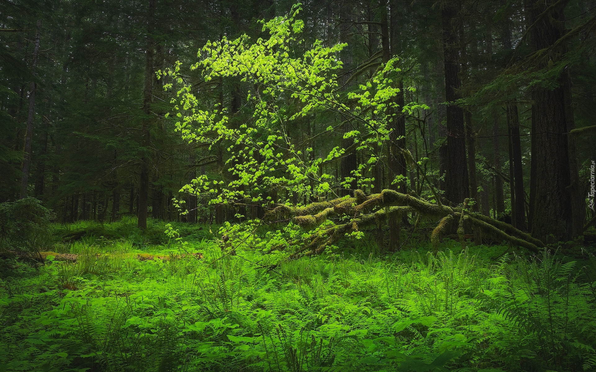 Edytor tapety: Paprocie pod gałęziami pochyłego drzewa w lesie