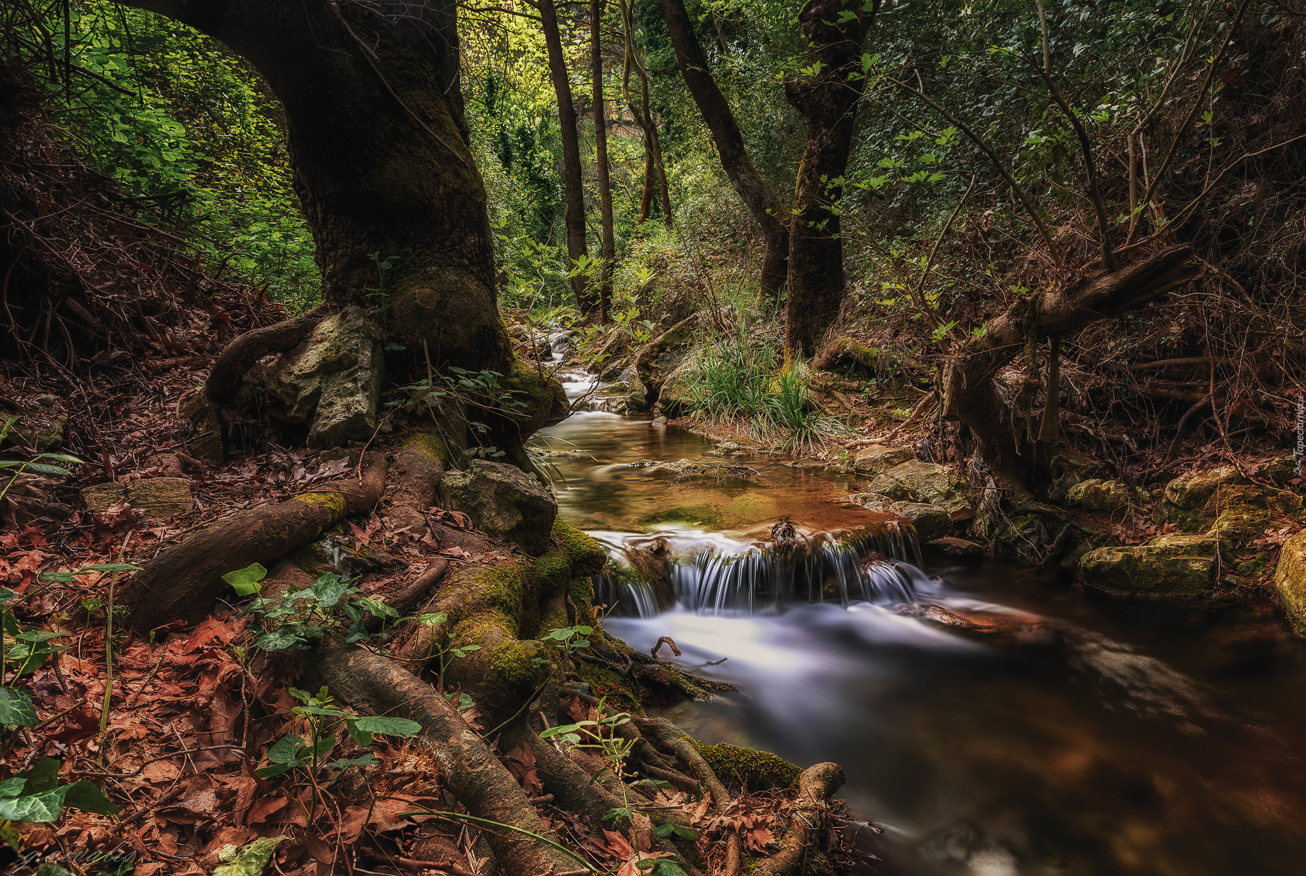 Edytor tapety: Korzenie drzew nad strumykiem w lesie
