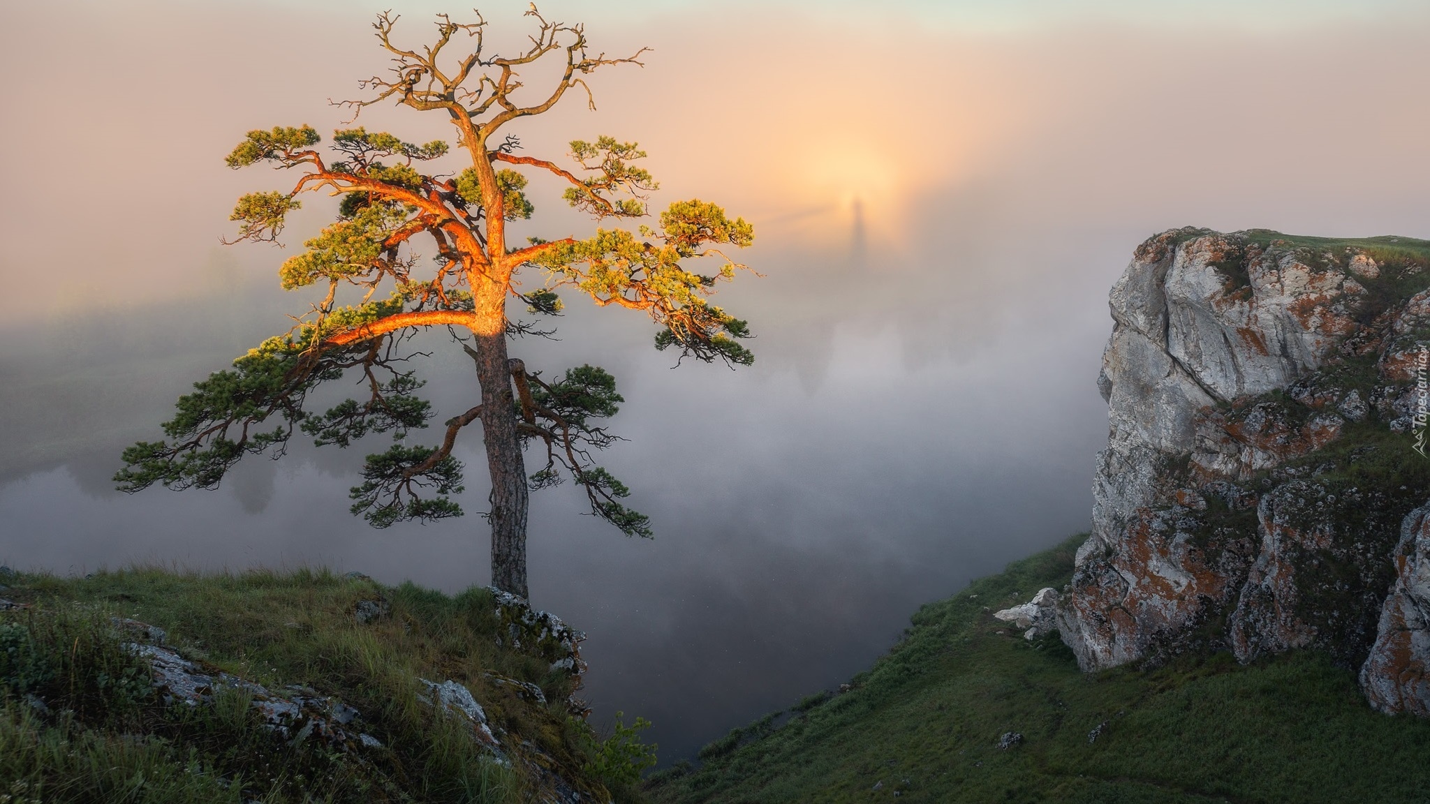 Edytor tapety: Oświetlona słońcem sosna na skale