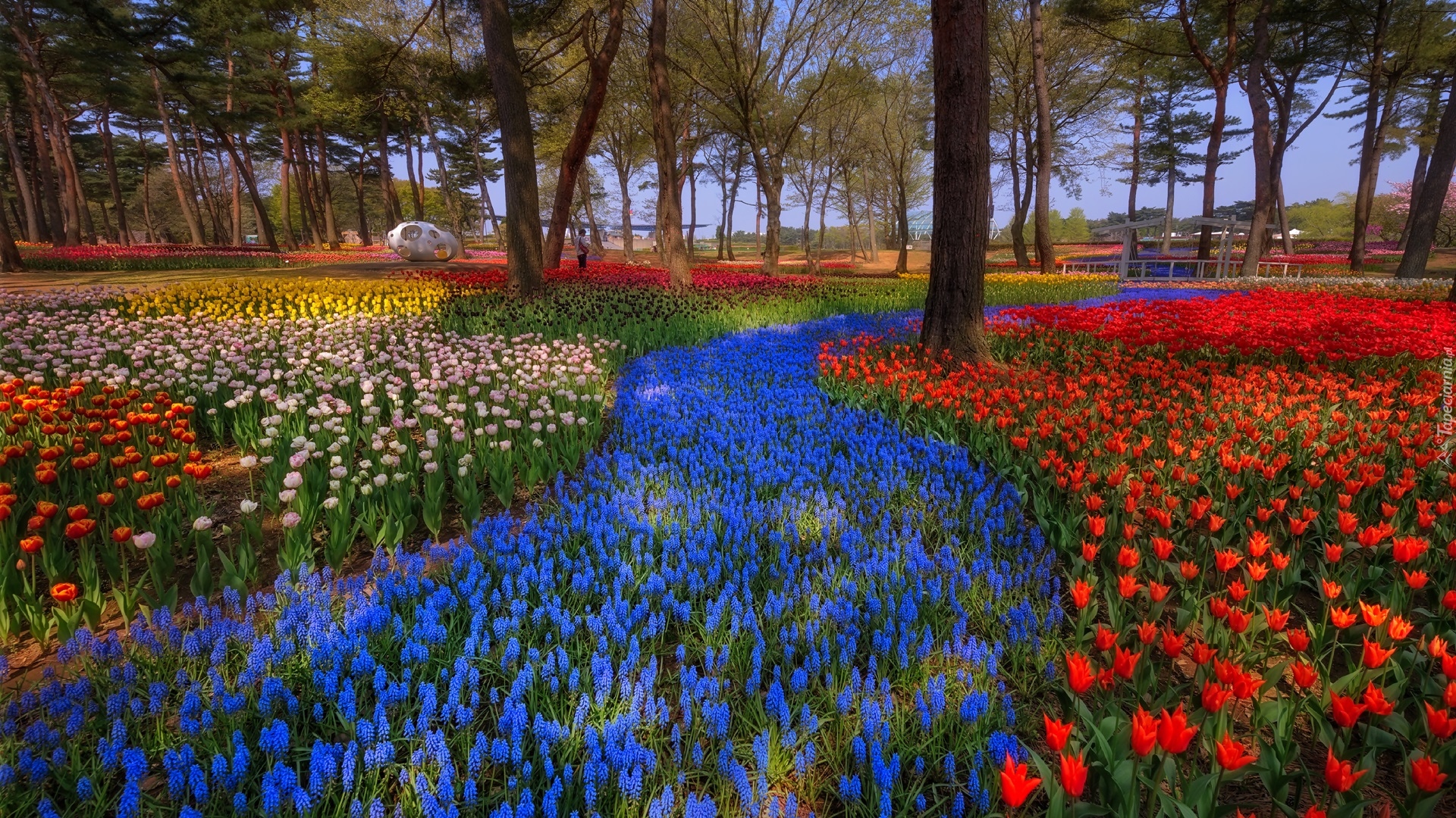 Edytor tapety: Dywan z tulipanów i szafirków w parku
