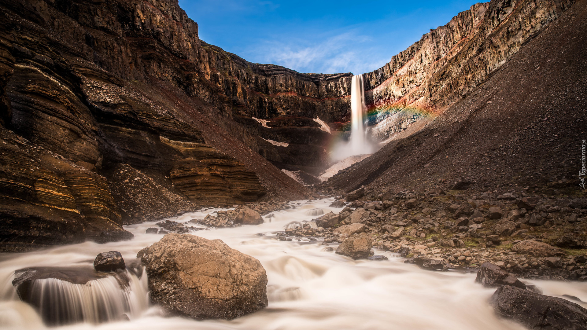 Edytor tapety: Wodospad Hengifoss wpadający do rzeki Hengifossa w Islandii