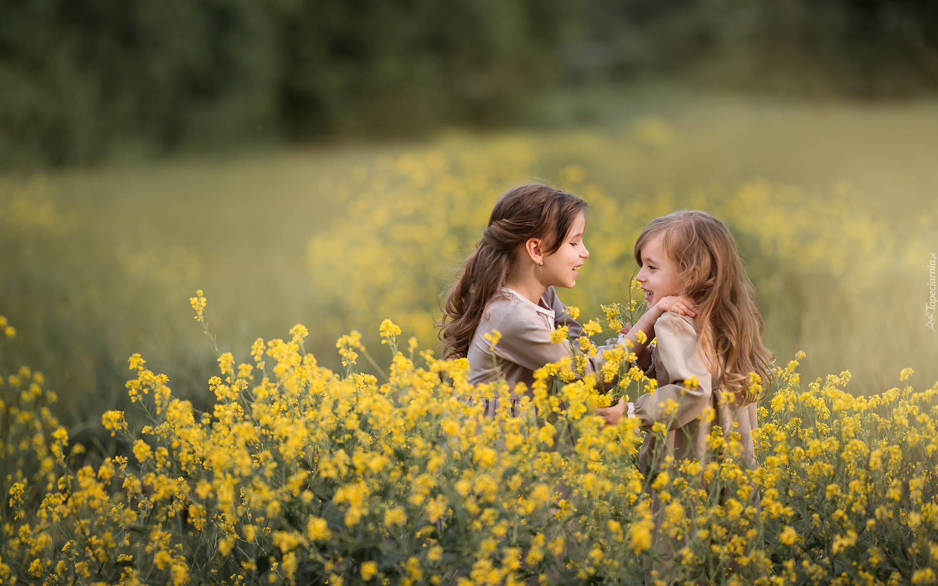 Edytor tapety: Dwie uśmiechnięte dziewczynki w rzepaku