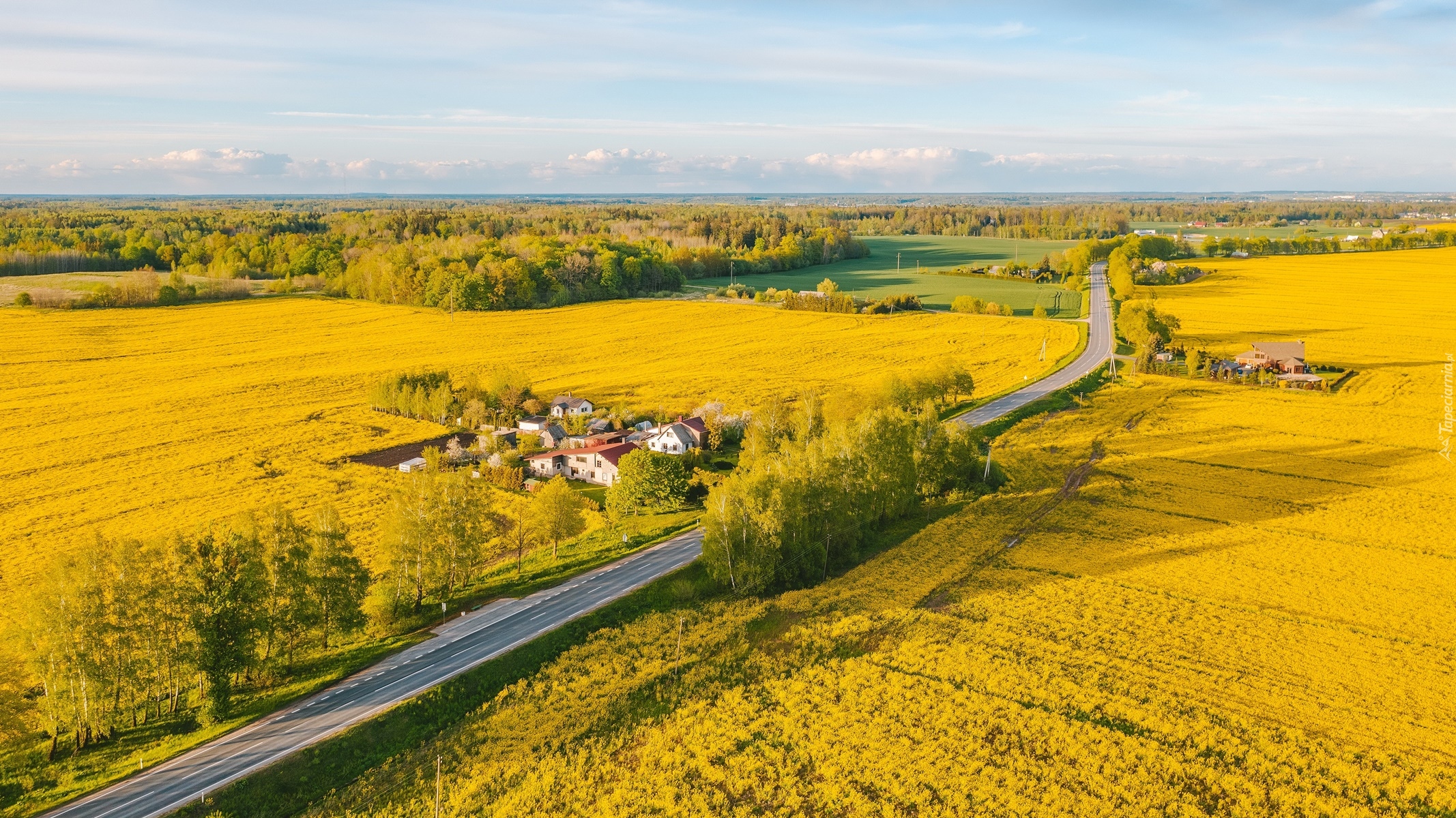 Edytor tapety: Farma na polu rzepaku obok drogi