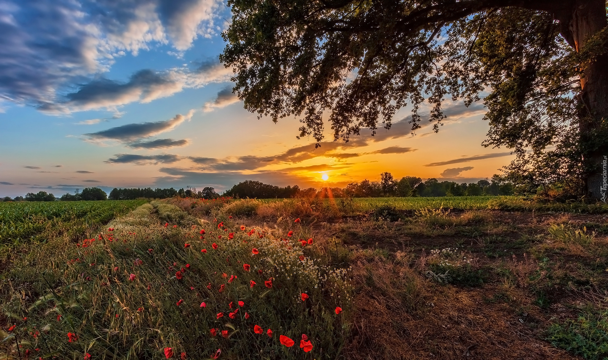 Edytor tapety: Maki i rumianki obok drzewa na polu