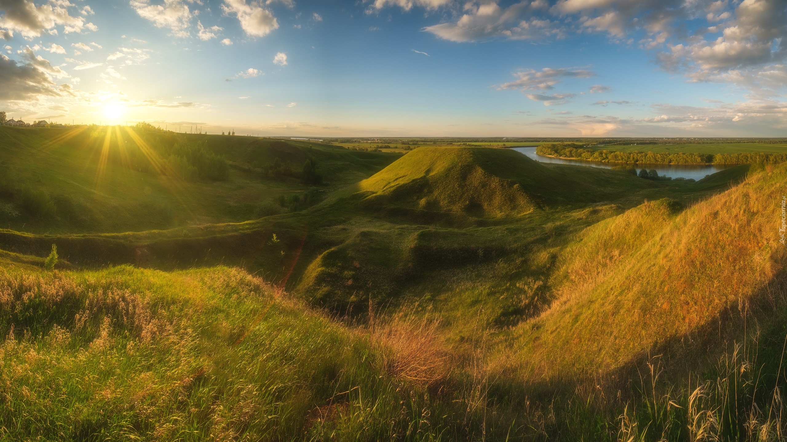 Edytor tapety: Łąka na wzgórzach w słonecznych promieniach