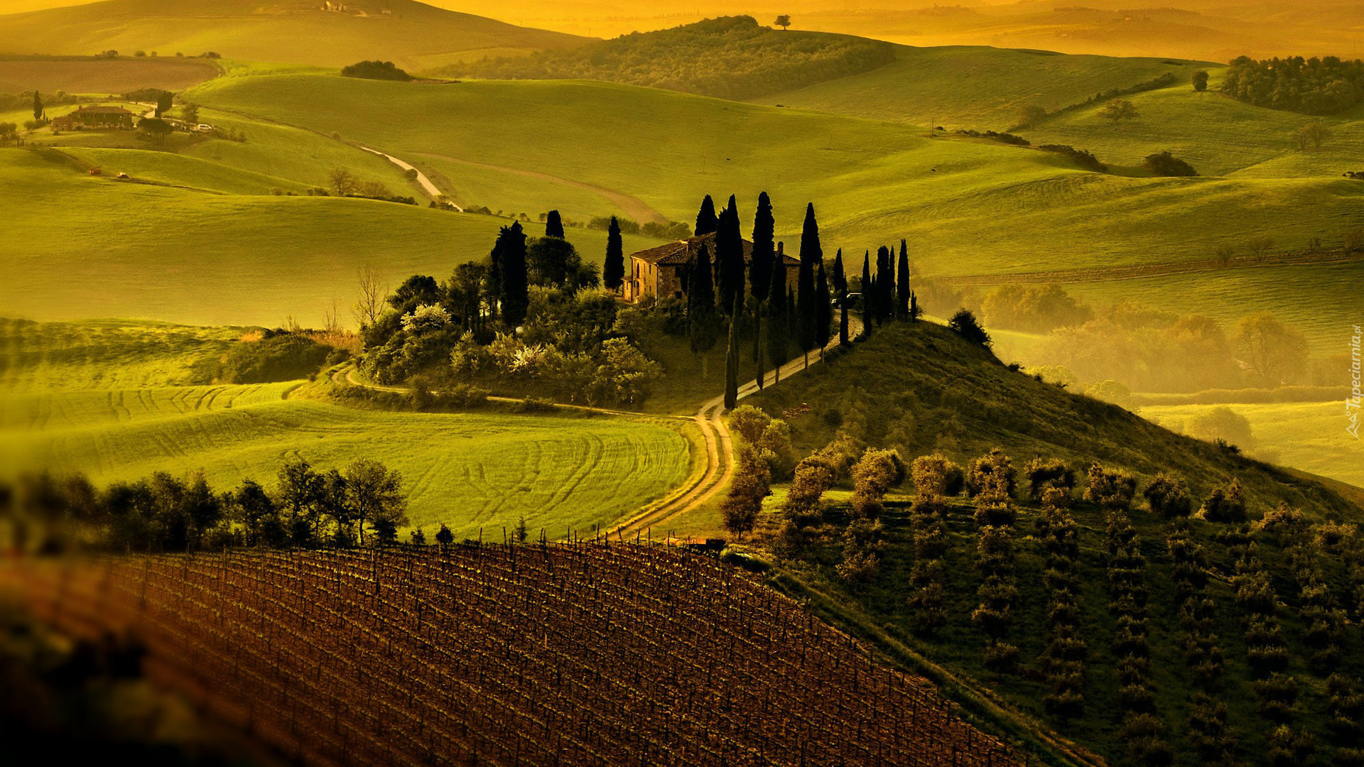 Edytor tapety: Pola uprawne i domek na wzgórzu w Toskanii