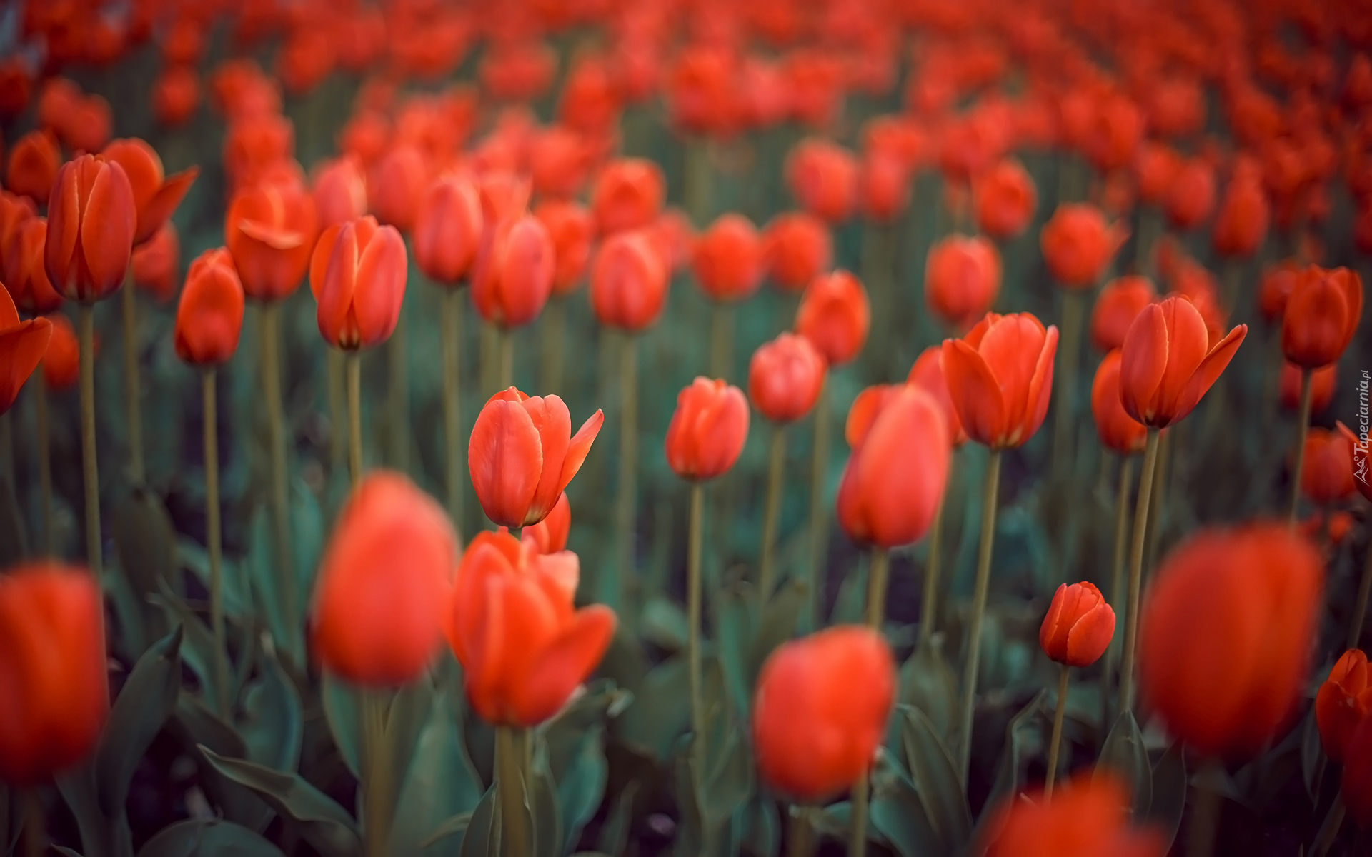 Edytor tapety: Czerwone tulipany z liśćmi w rozmyciu