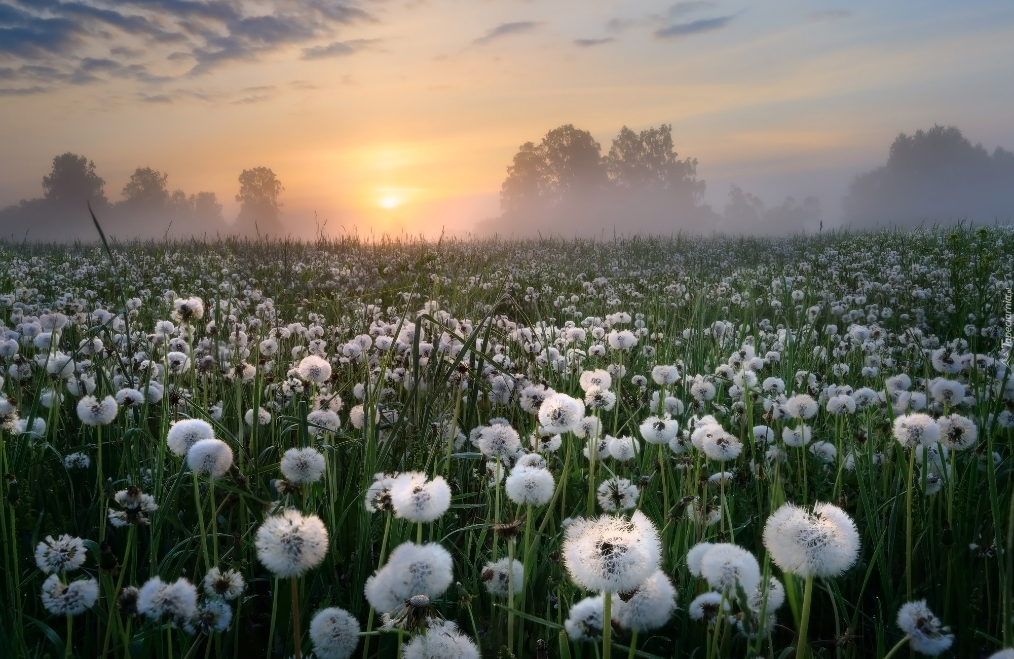 Edytor tapety: Dmuchawce na łące o wschodzie słońca