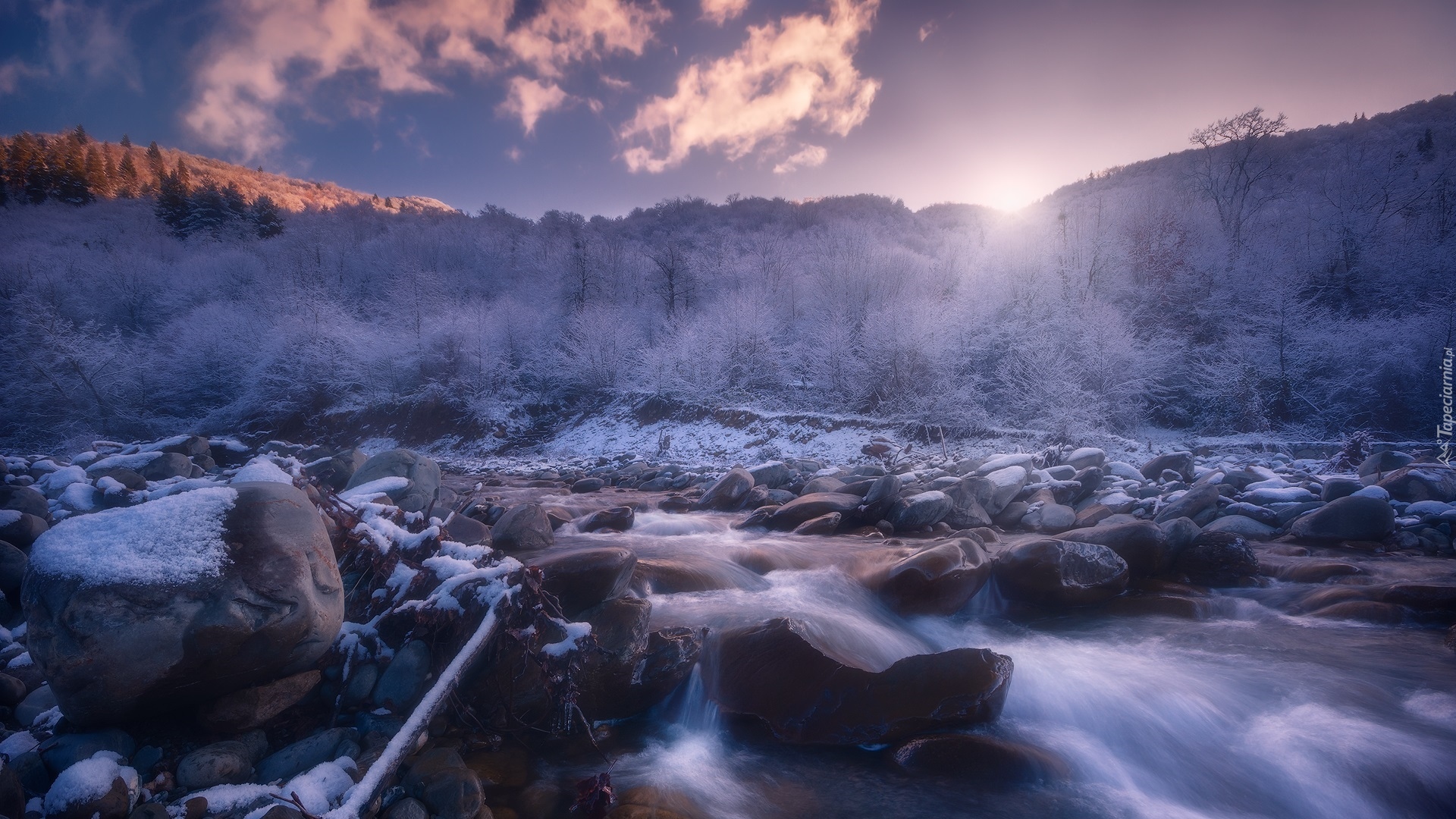 Edytor tapety: Oszronione drzewa nad kamienistą rzeką
