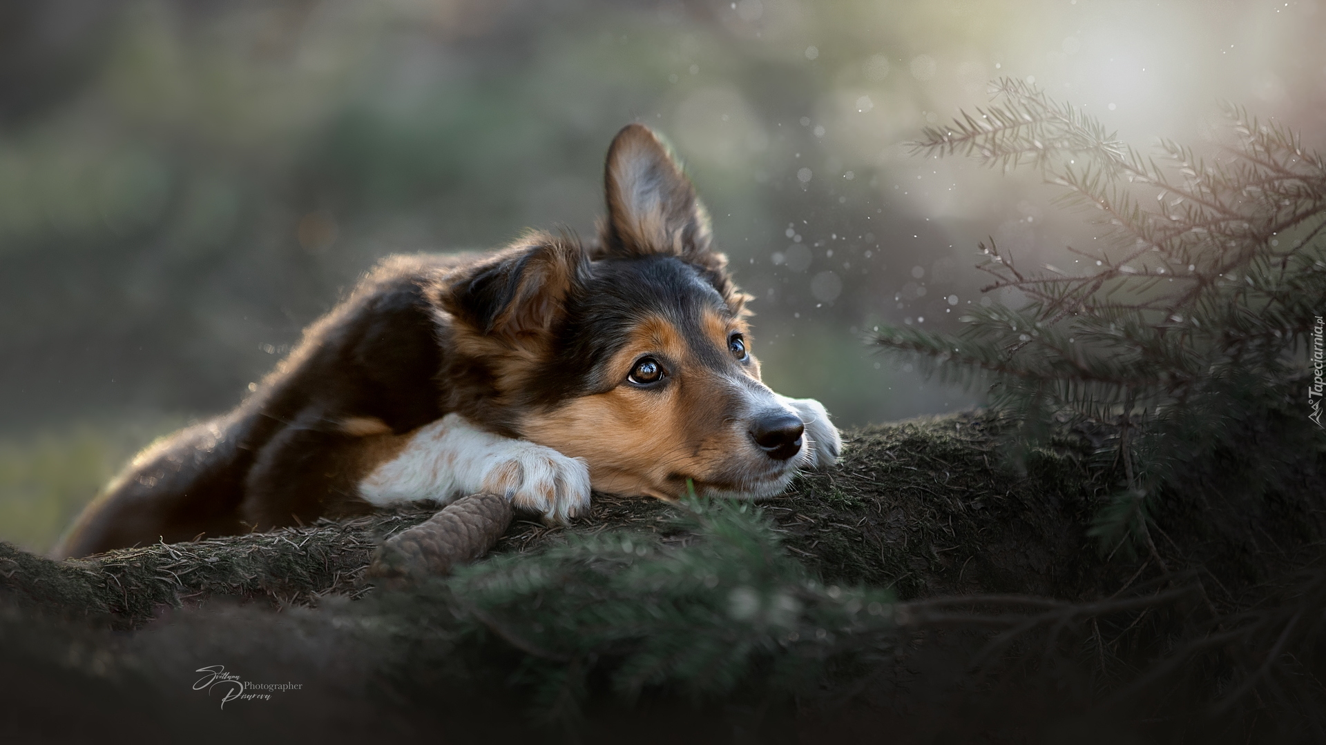 Edytor tapety: Szczeniak oparty o kłodę