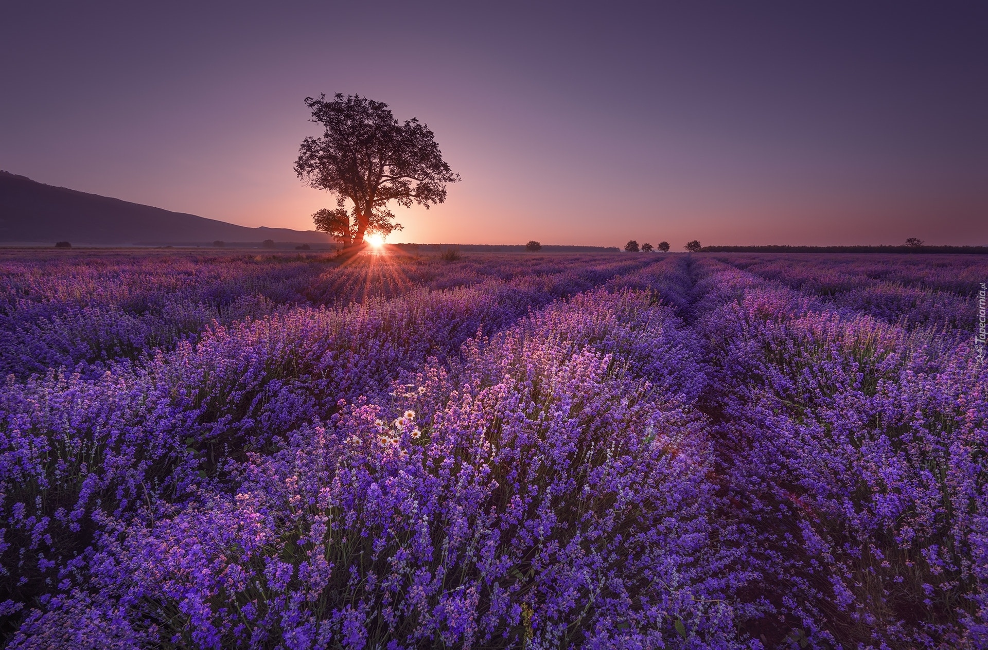 Edytor tapety: Drzewo na polu lawendy w promieniach słońca
